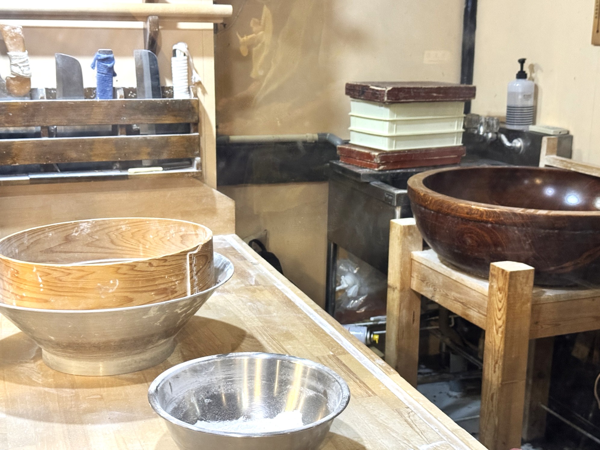 日中は時々ここでそばを打つ様子を見られるということなので、タイミングが良ければ、目の前で職人がそばを打つ姿を見学できるかもしれませんね!