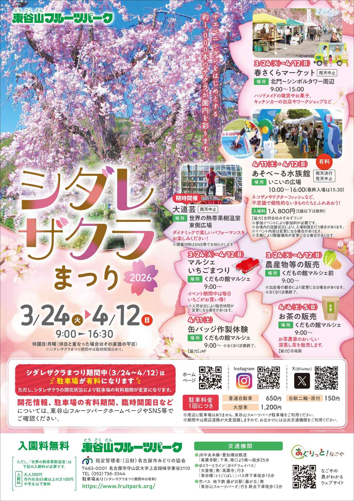 守山区・東谷山フルーツパークに約1,000本のしだれ桜が一斉に咲き誇る、名古屋随一の桜の絶景スポット。ソメイヨシノとは一味違う、枝がやわらかく垂れ下がる独特の美しさは必見です。農産物の販売やキッチンカー、マルシェなども開催され、見て食べて楽しめる内容が充実。4月中旬まで見頃が続き、ほかの桜スポットが散ったあとも楽しめます。