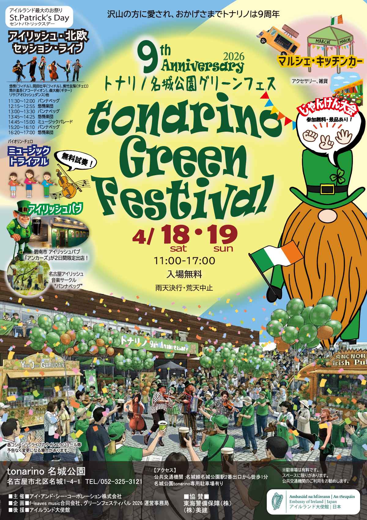 名城公園tonarino前の広場を舞台に、アイルランドをテーマにしたケルト音楽と春のマルシェが融合した2日間のフェスティバル。緑豊かな名城公園の景色の中で、生演奏を聴きながらクラフトビールやグルメを楽しめます。雑貨・植物・食のマルシェも充実しており、家族連れからカップルまで幅広い層が楽しめます。