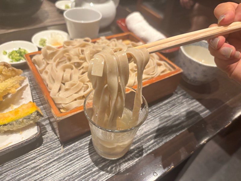 噛んだ瞬間の粒感と力強い歯ごたえが印象的で、噛むごとに黒糖のような香りがふわりと広がります。つゆは切れ味がありつつもふくよかで、蕎麦の風味を引き立てながらも負けない存在感を持っています!