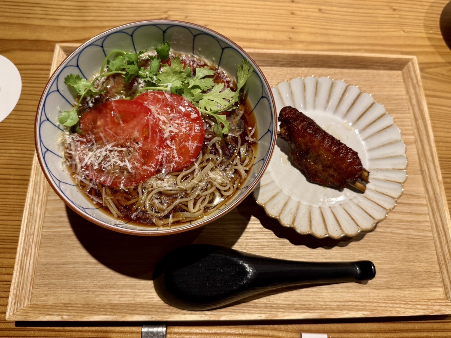 真っ赤に熟した国産トマトと、雪のように削られたチーズの組み合わせは、見た目にも華やかです。ひと口すすれば、蕎麦の香りにトマトの酸味とチーズのコクが調和し、和と洋の融合を感じることができる新感覚の味わいです。