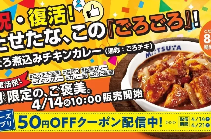 松屋が誇る「ごろごろ煮込みチキンカレー」、通称「ごろチキ」が、期間限定で復活販売されていますよ。名古屋の松屋でもこの待望の味を楽しめるので、ぜひチェックしてくださいね。
