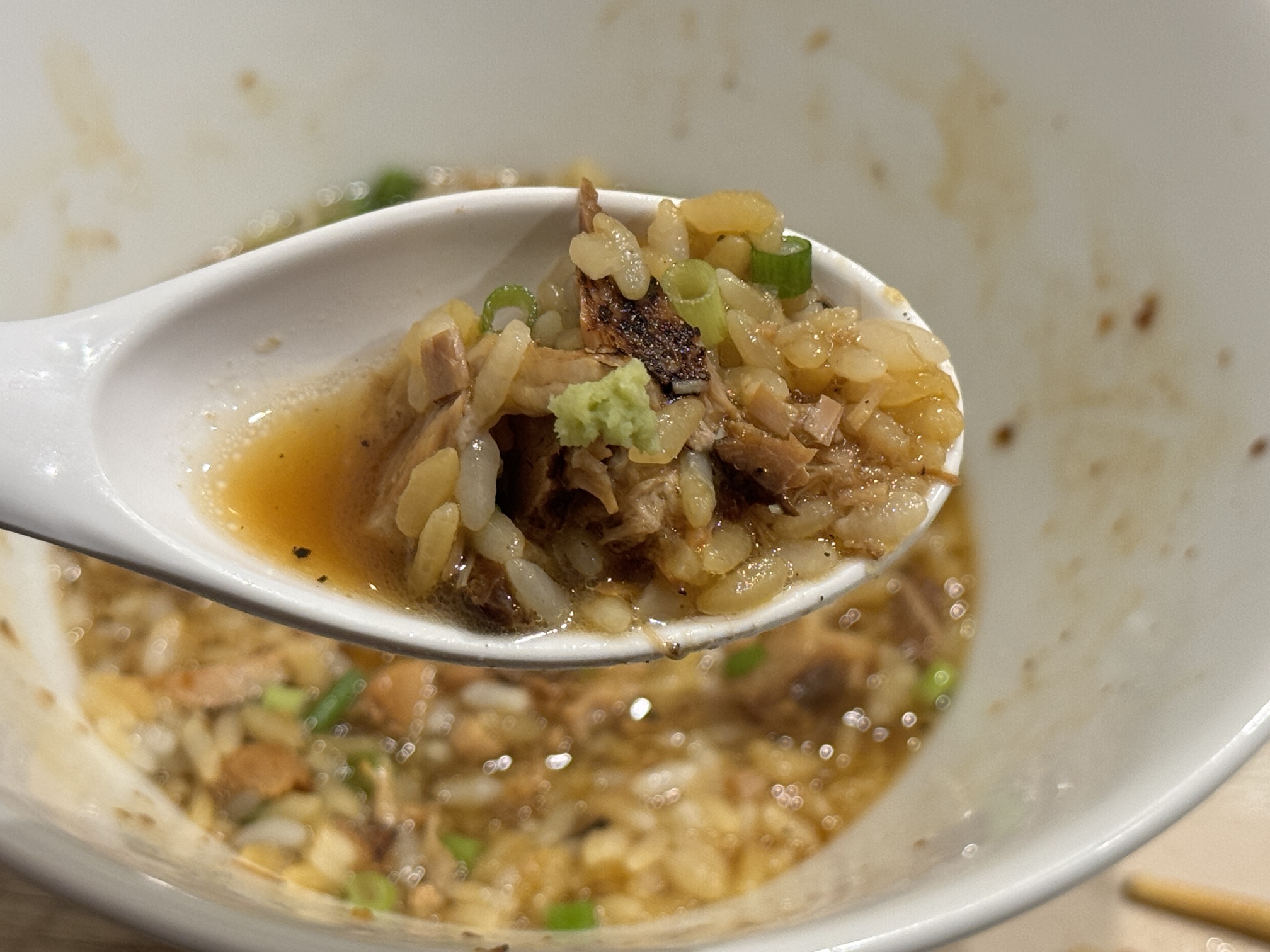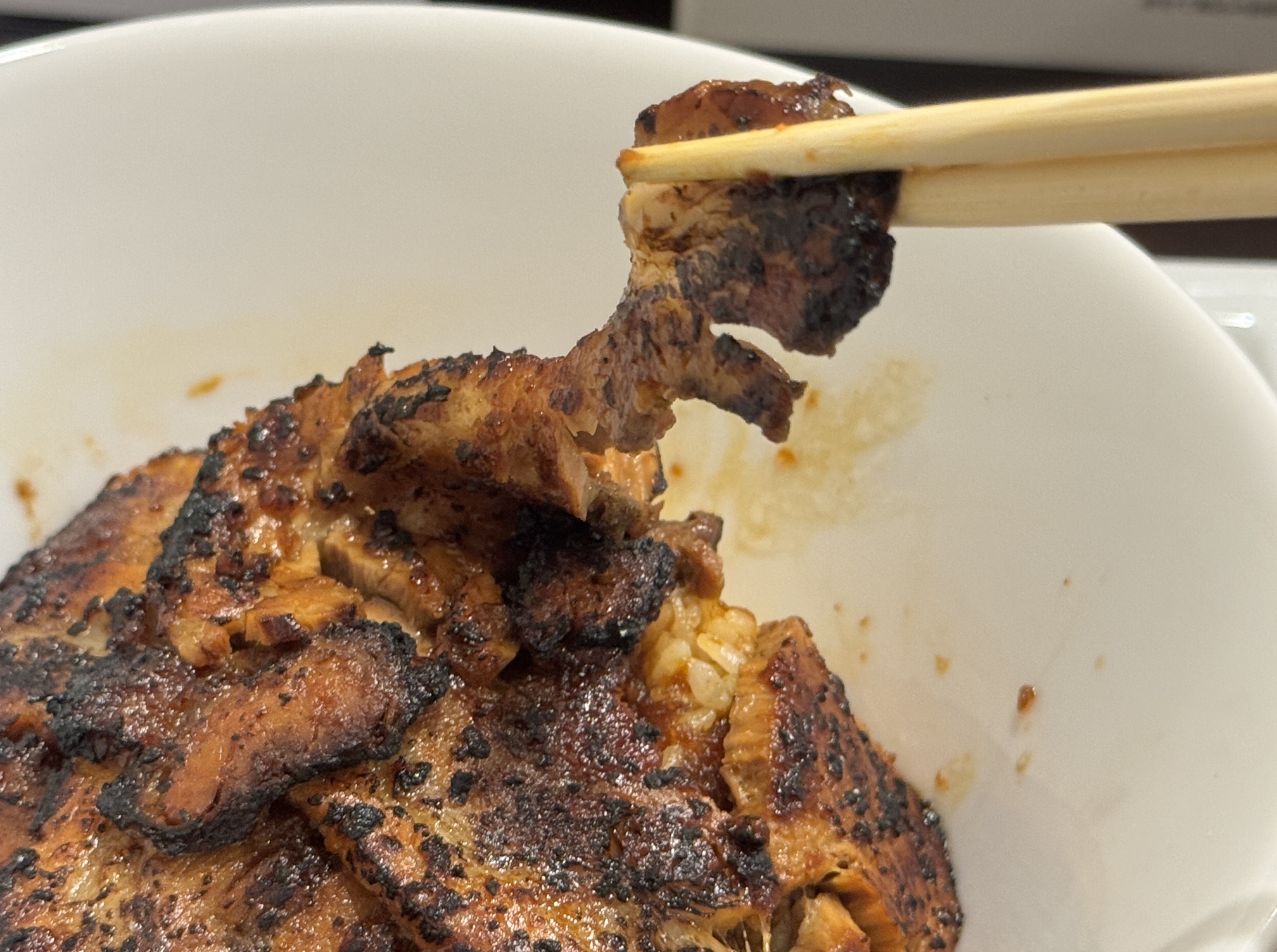 タレが絡むご飯には、ほぐしたチャーシューをさらにオン!