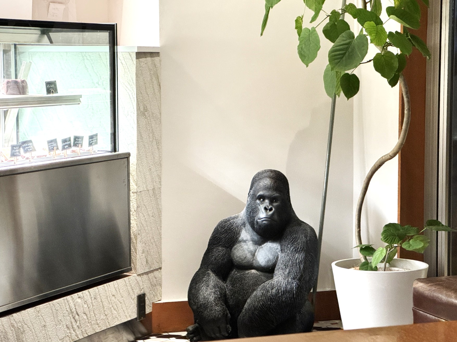 そんな理由で出入り口に近い席を選んだのですが、どこからともなく感じる謎の視線…。振り返ってみると、そこにいたのは体育座りをしているリアルなゴリラ(笑)!めっちゃこっち見てる!気になって何度もゴリラに視線を向けてしまうことは必然で落ち着かないかも?と思ったのですが、同行の友人がこのゴリラをたいそう気に入った様子だったので、まっすぐ注がれるゴリラからの視線を浴びながらここで飲食することを決めました。
