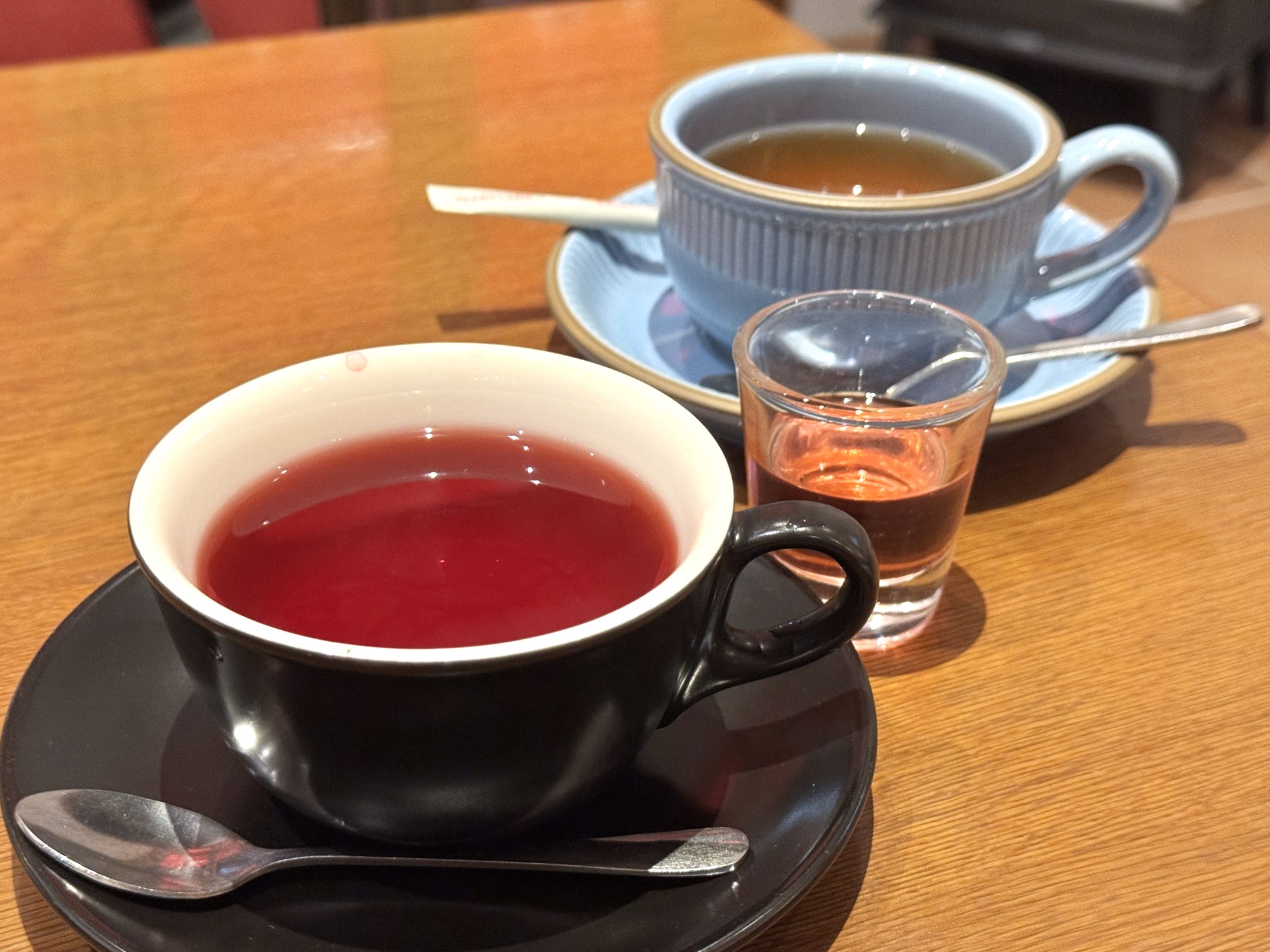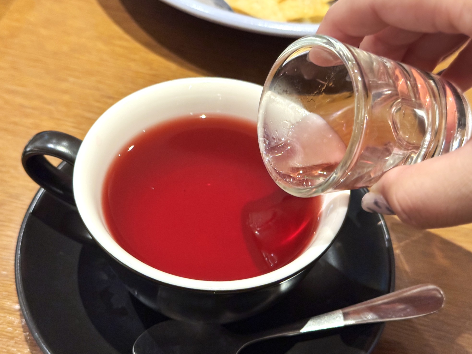 ハーブティーはローズヒップやハイビスカスといった酸味のある赤色に抽出されるものがベース。酸味の強いローズヒップティーを普段はあまり飲まないのですが、その酸味を緩和する甘いローズシロップを後入れすることでちょうどいい塩梅になります。