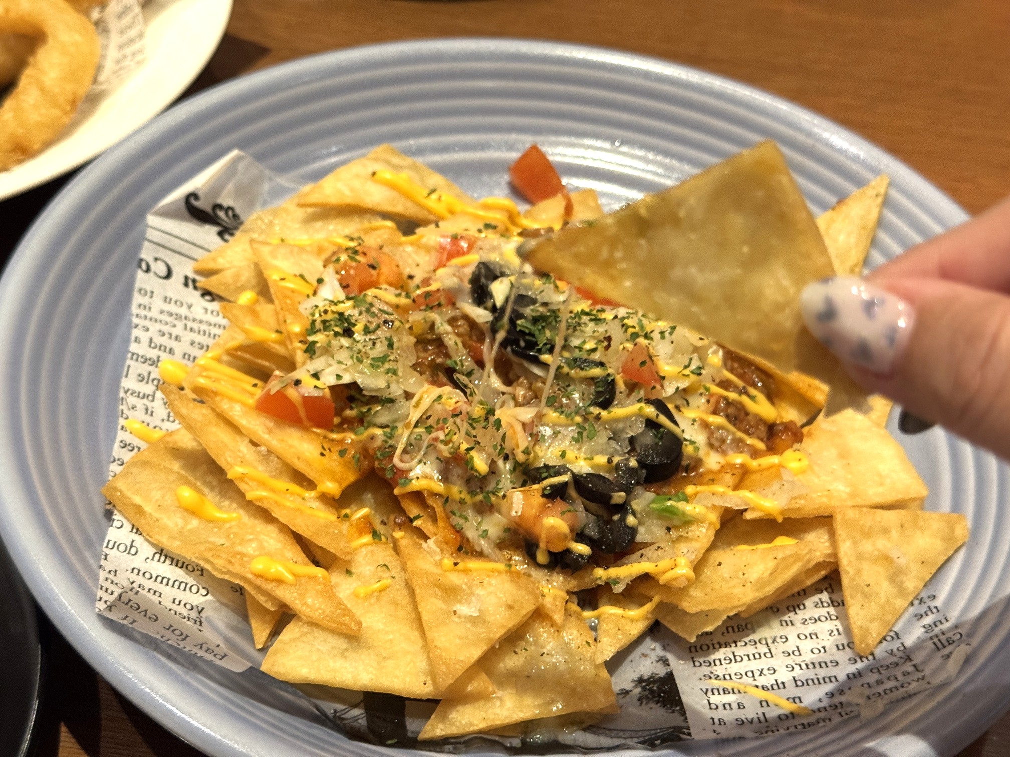 パプリカやオリーブ、チーズをトッピングした揚げたてのナチョスはとても美味しくて、おしゃべりとともについ手が伸びてしまうくせになる味わいです。