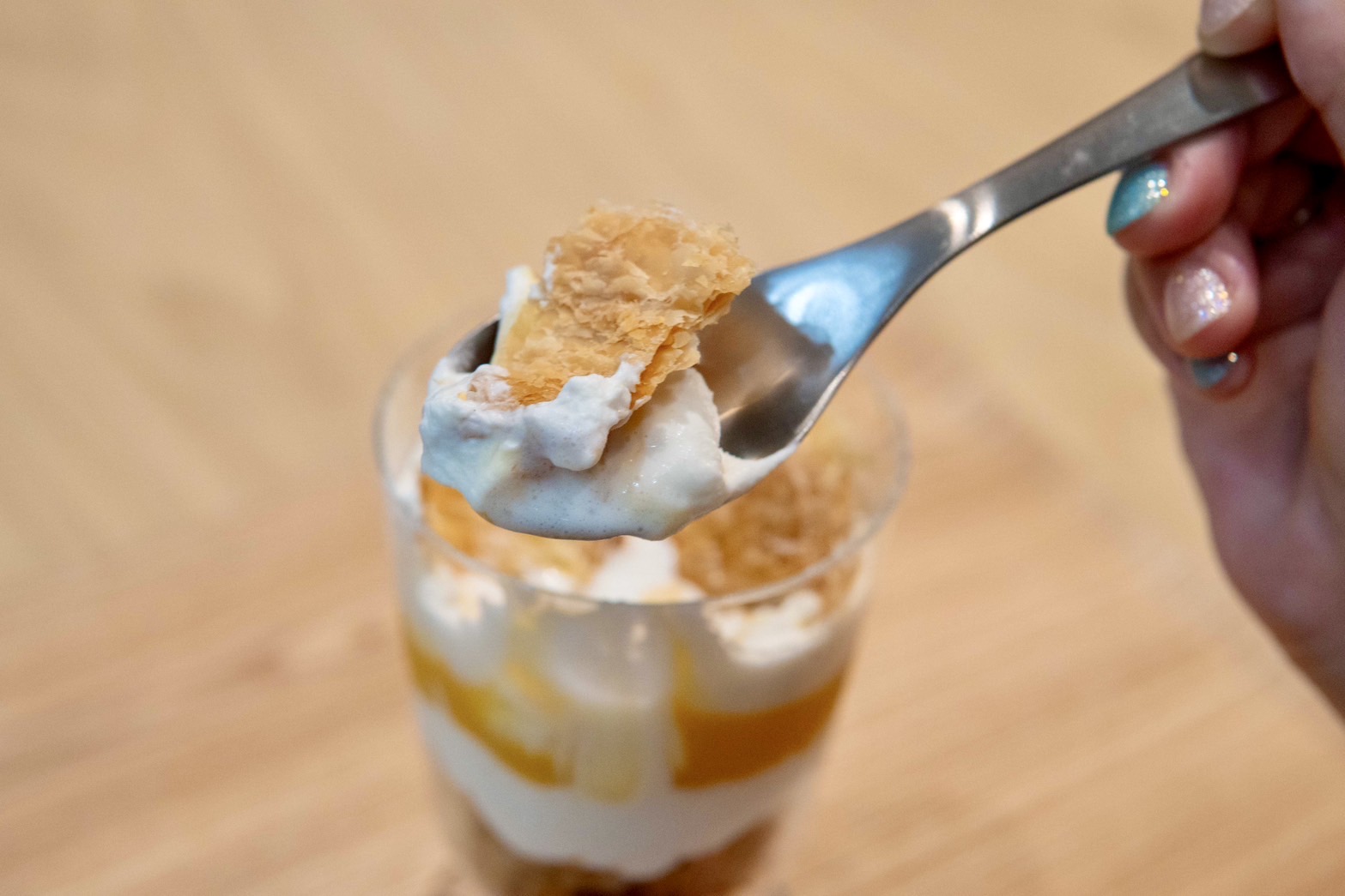 グラスの底とトップには、ざくざく食感のパイをたっぷり使用。