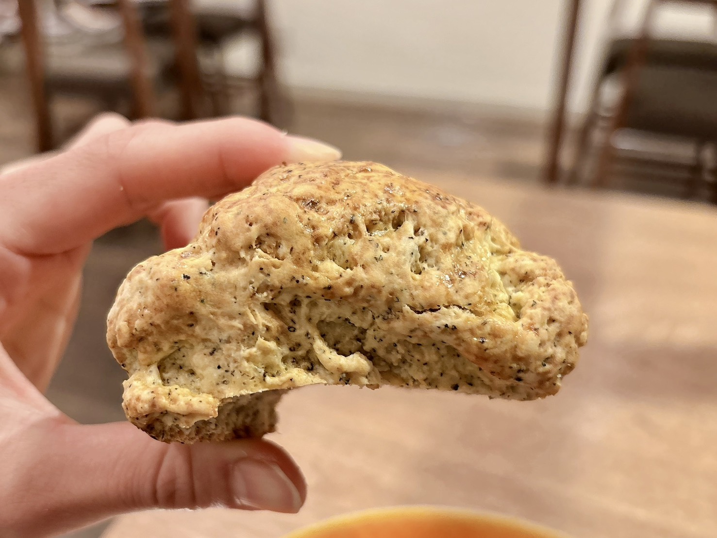 ほどよい硬さのスコーンはザクっと口の中で砕け、中はしっとりほろっとした生地が口の中でいっぱいに広がります。
