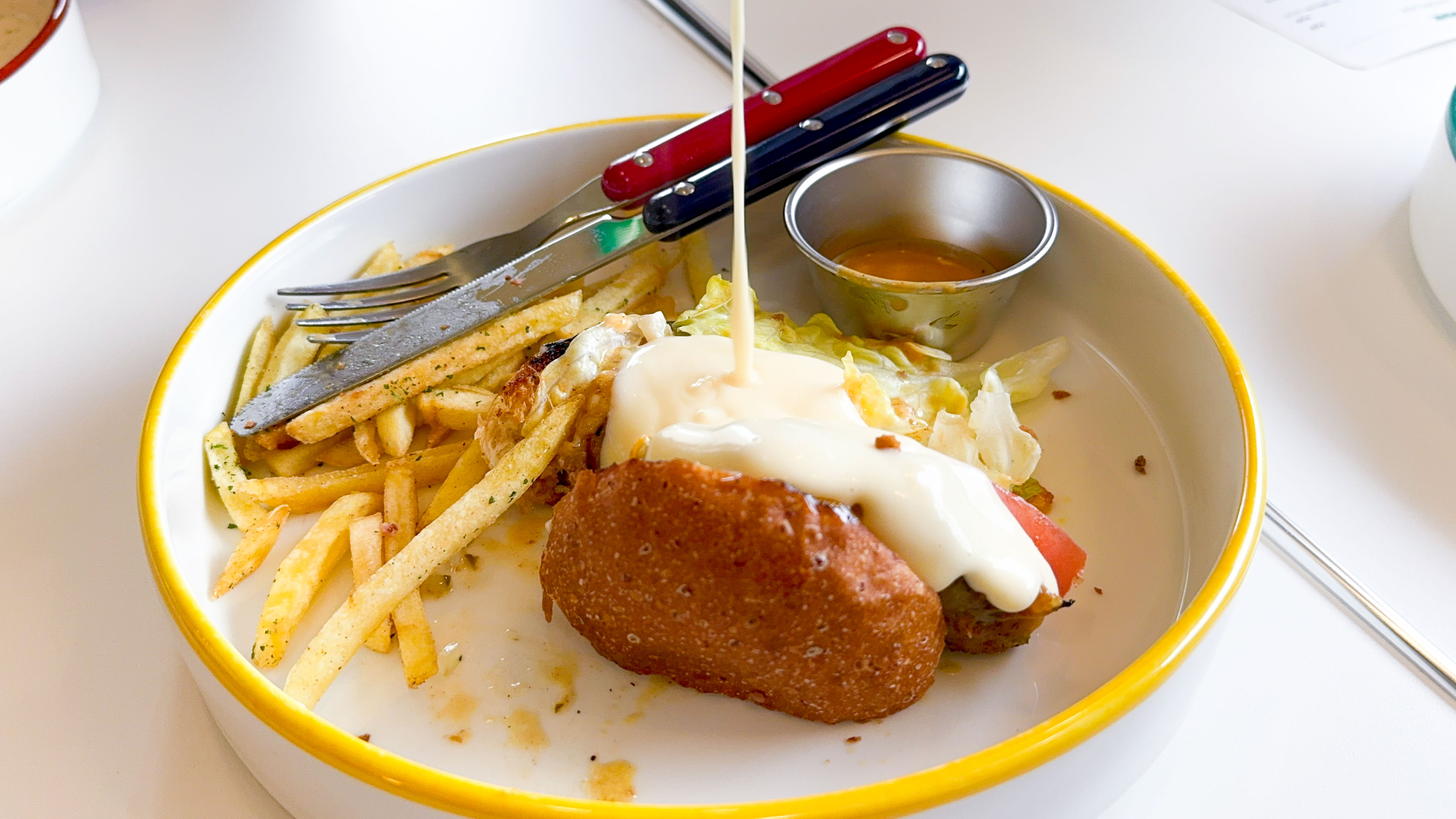 バーガーにトッピングされていたチーズとはまた違い、ソースで使われているチーズはクセのないあっさりとした味わい。たっぷりかけてもクドさがなく、ペロリといただけます◎