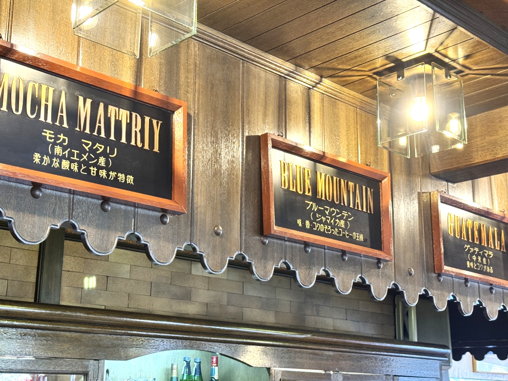 カウンター席の上には、同店で提供しているコーヒーの名前と特徴を記した看板が並んでいました。