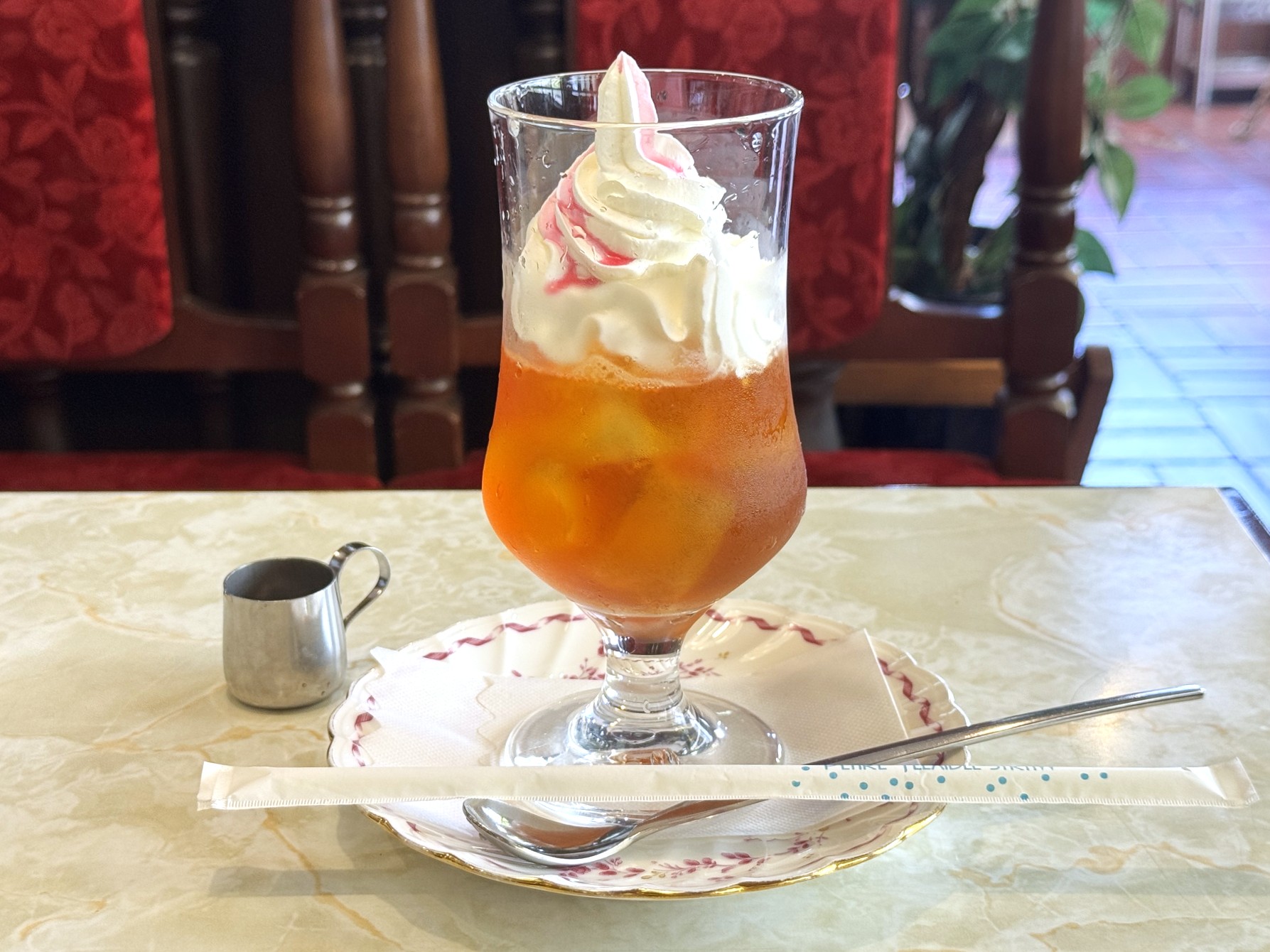 今回いただいた「スペシャルロシアンティー」は、ジャムを溶かしたアイスティーにホイップクリームとフルーツソースをトッピングした見た目も可愛らしいアイスティー。