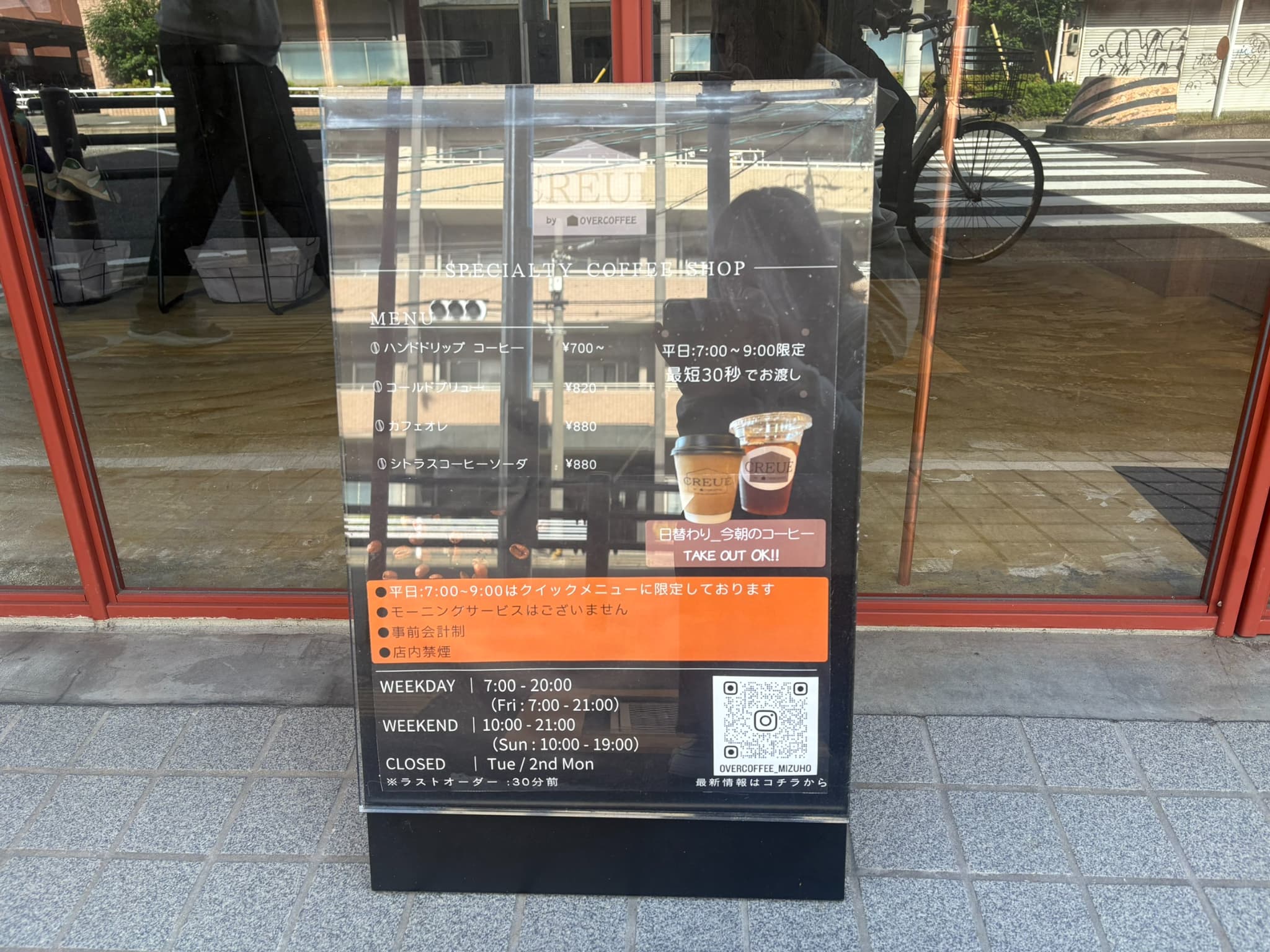 今回訪れたのは、地下鉄名城線・桜通線 新瑞橋駅から徒歩3分の大通り沿いにある「CREUE by OVERCOFFEE(クリューバイオーバーコーヒー)」さん。