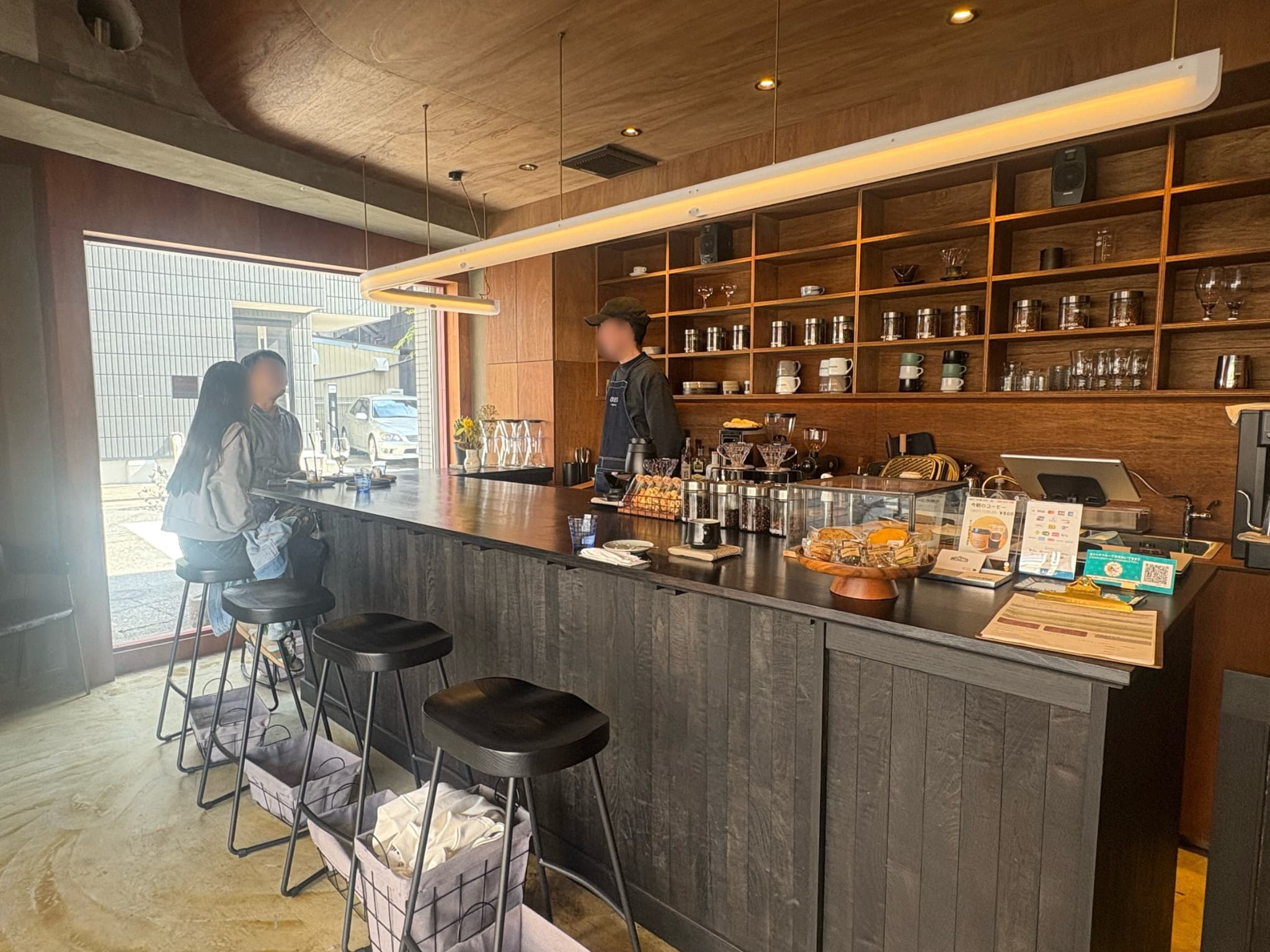 店内に入ると、コーヒーの香りがふわっと広がります。自然光が程よく差し込む落ち着いた空間で、目の前にはオープンカウンターがあります。