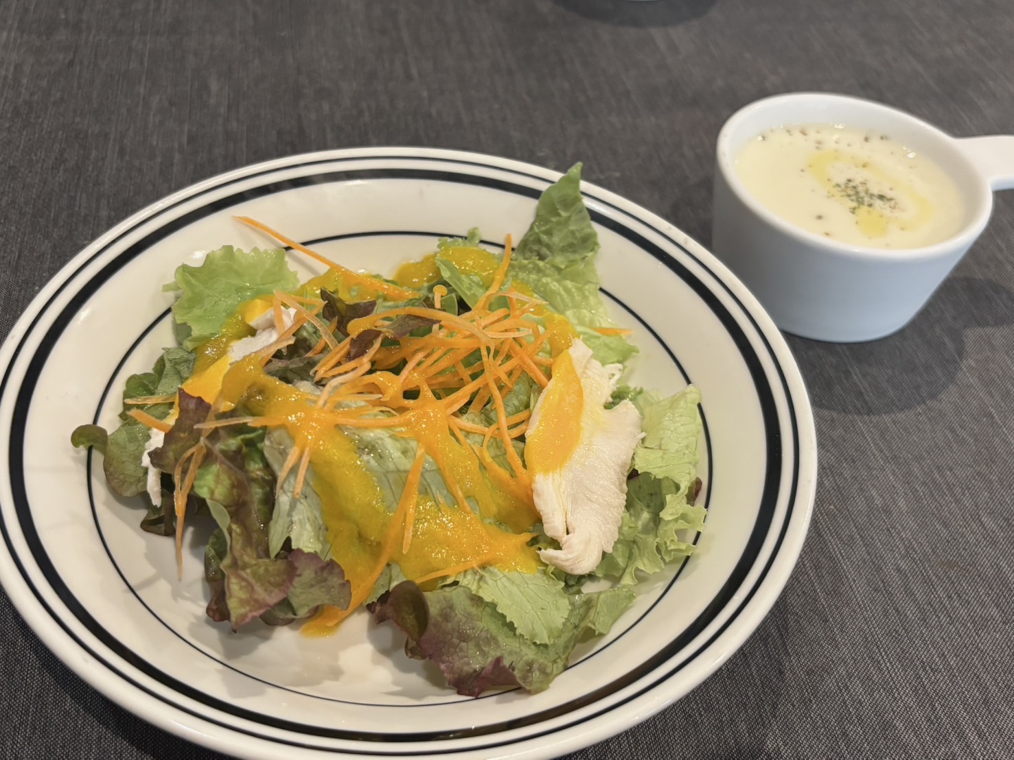 サラダにはレタス、細切りニンジン、サラダチキンまで使われており、人参ドレッシングが全体の味を引きたてています。