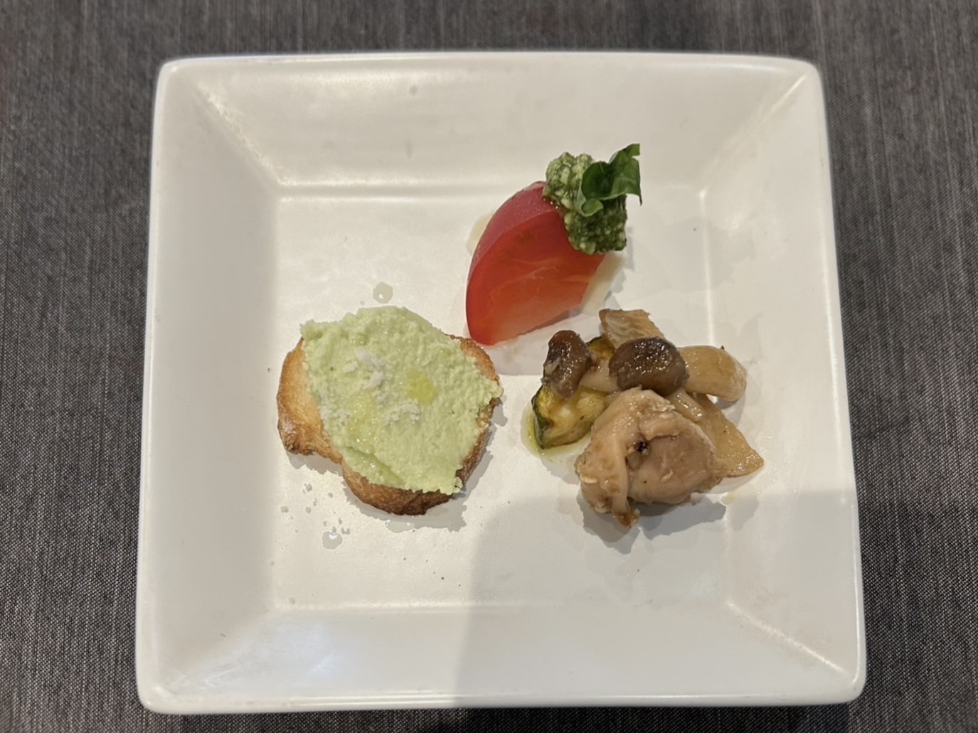 枝豆のムースは、パリパリサクサクのバゲットに、塩味の効いた枝豆のムースがのった一品。ムースは、ザラっとした舌触りで、素材そのものの味わいを感じられました。