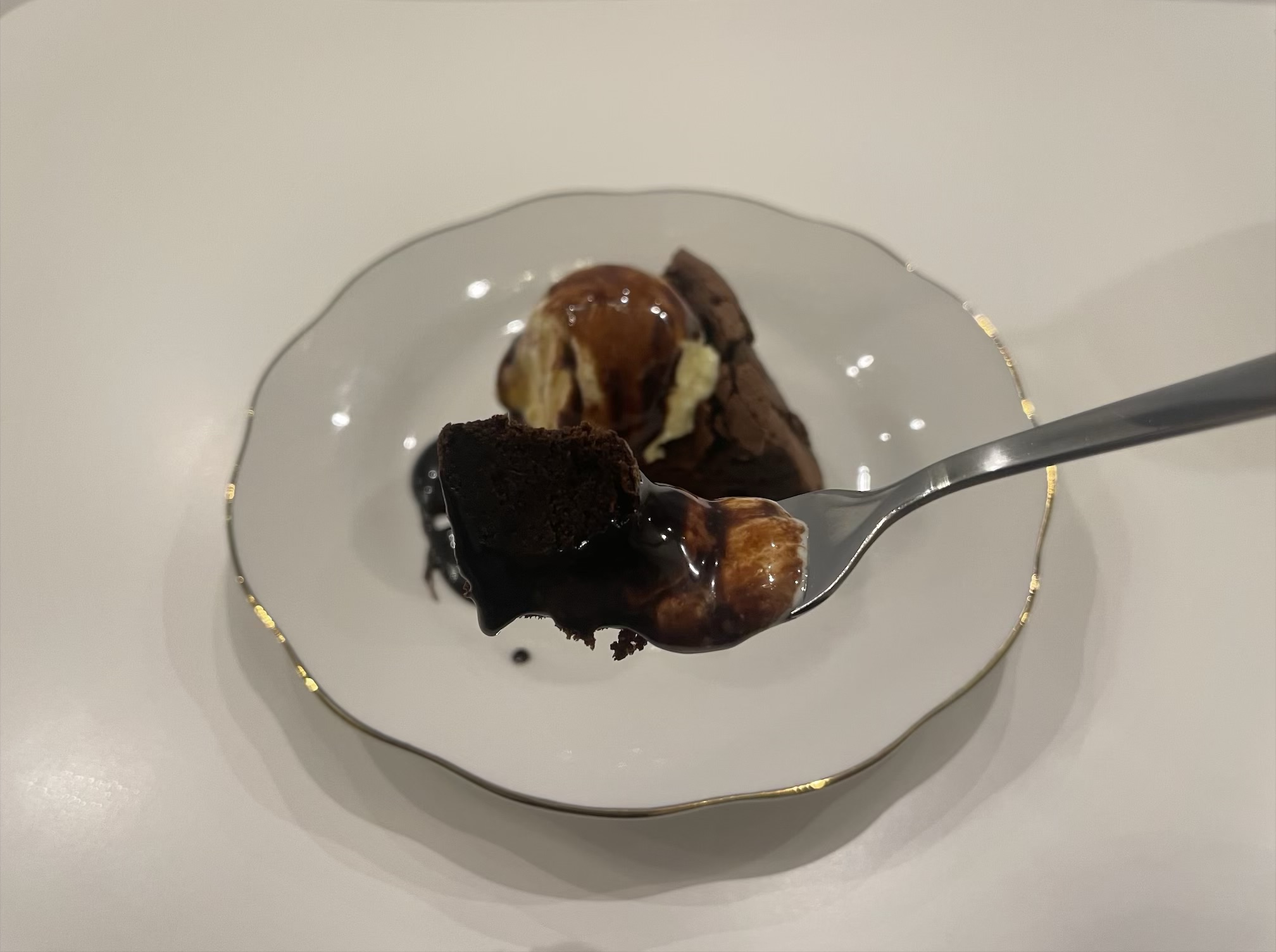 ガトーショコラ、アイスクリーム、チョコレートソースの3拍子の相性は言うまでも無くバツグンで、甘くちょっぴりビターなお味が楽しめます♪