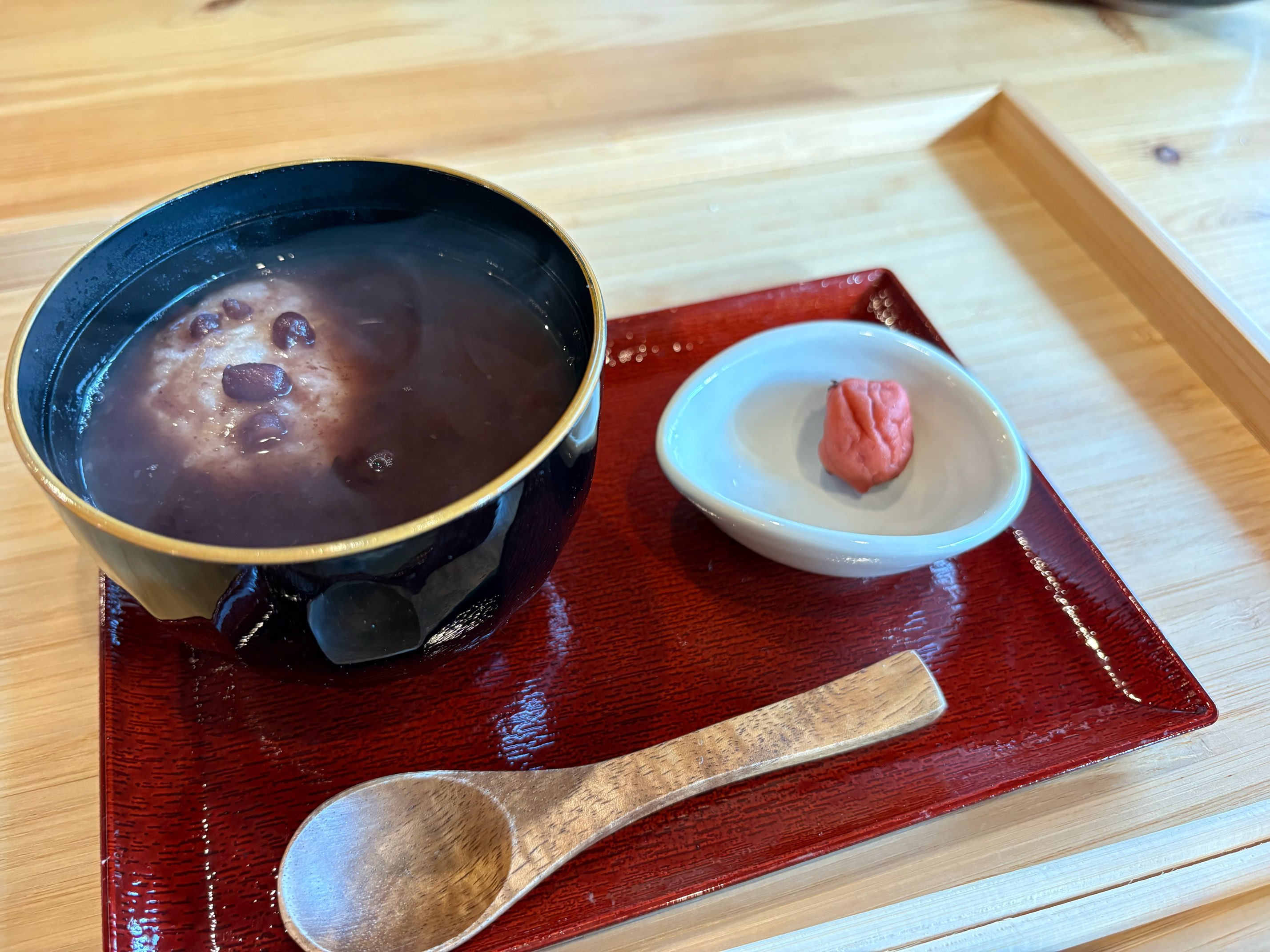 自家製あんこを目一杯楽しめる一品。ぜんざいは甘めのお味なので、梅干しの塩味がちょうど良い休憩になります。