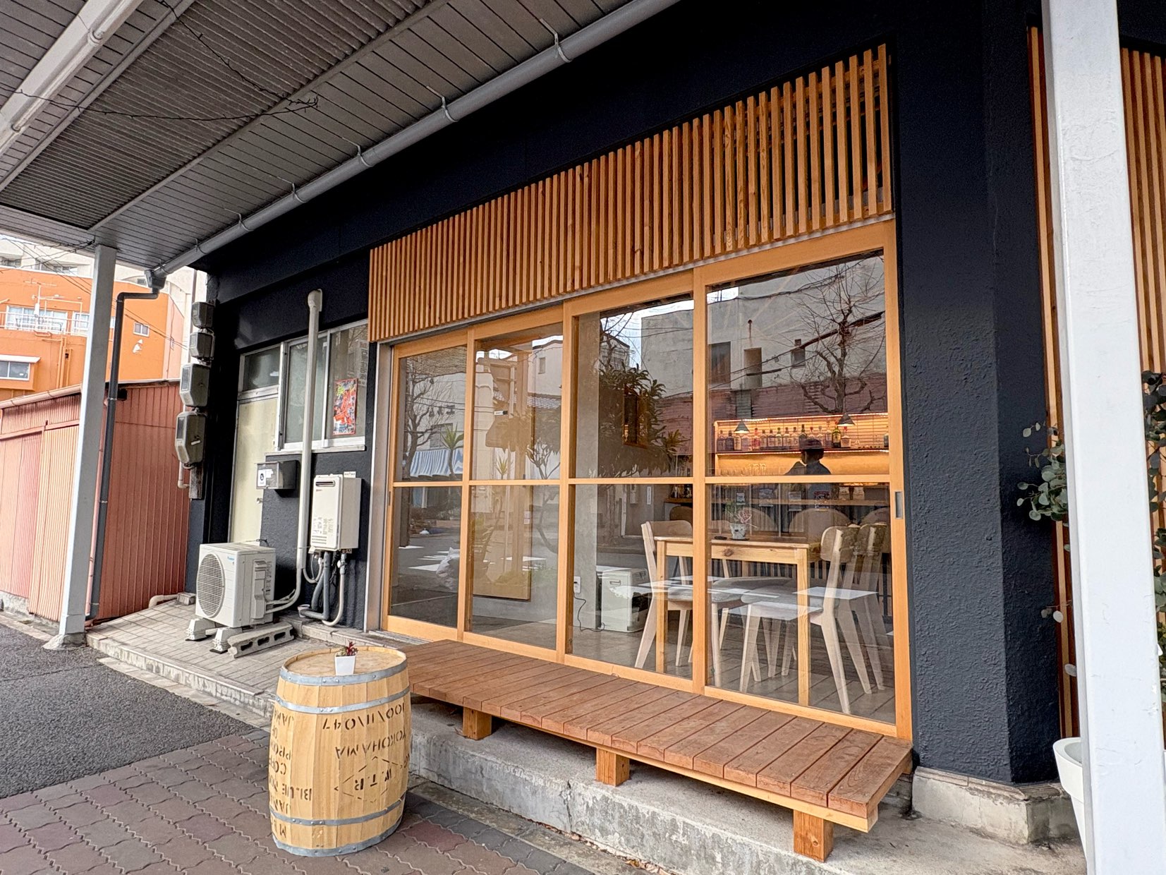 左へ進むと縁側を彷彿とさせる造りが!洋風な樽のテーブルと相まっておしゃれですね♪