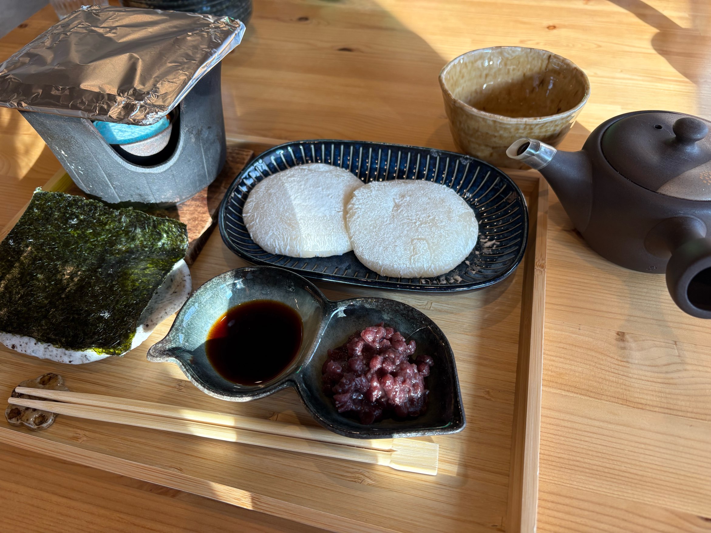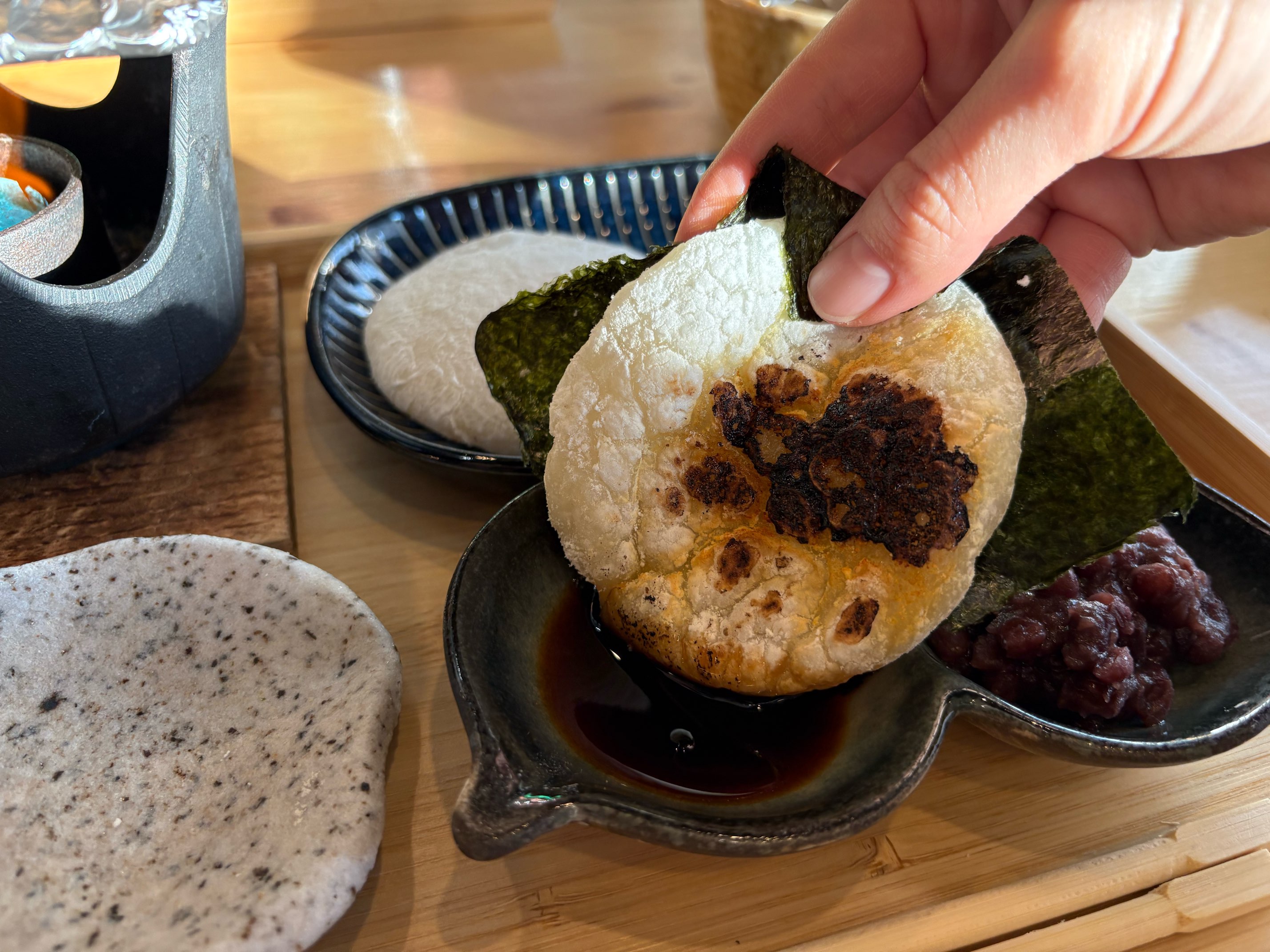 トッピングは、自家製あんこ、北海道産きなこ、岐阜県産だし醤油の大根おろし、岐阜県産だし醤油と鬼崎産海苔の4種類から2種類を選べます。