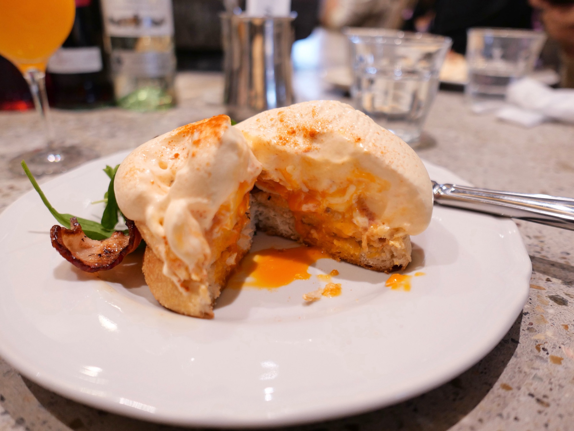 自家製のマフィンの上に、愛知県産の契約農家から仕入れた卵で作られたポーチドエッグ、香ばしく焼かれたベーコン、そしてエスプーマ状のオランデーズソース。