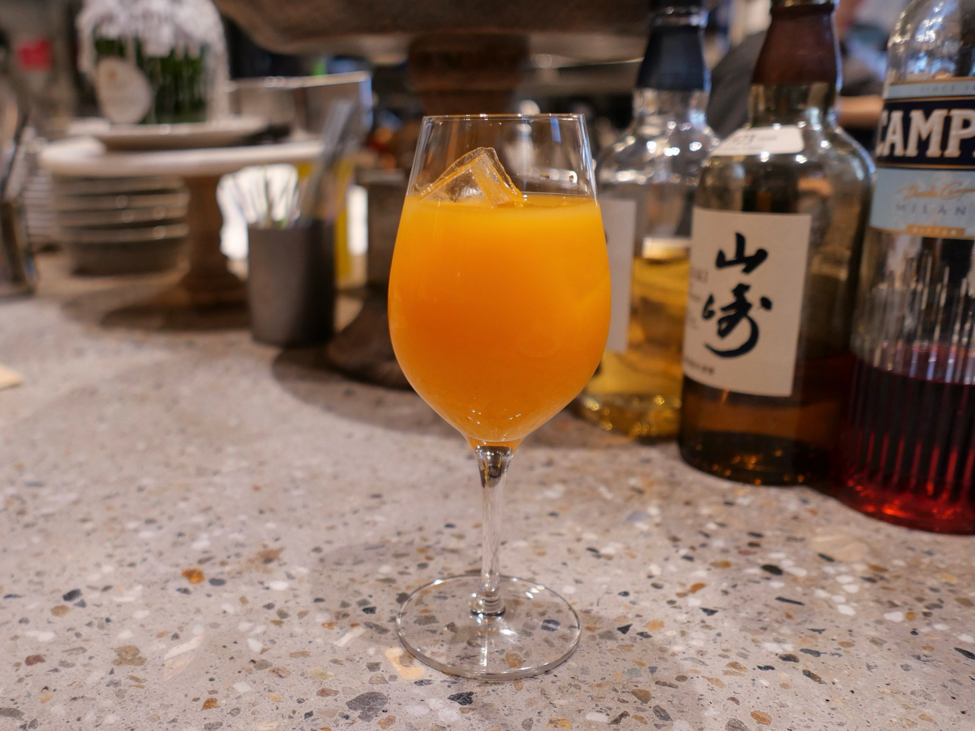 ジュースはワイングラスに注がれ、濃いオレンジ色で、飲む前から期待が高まります。