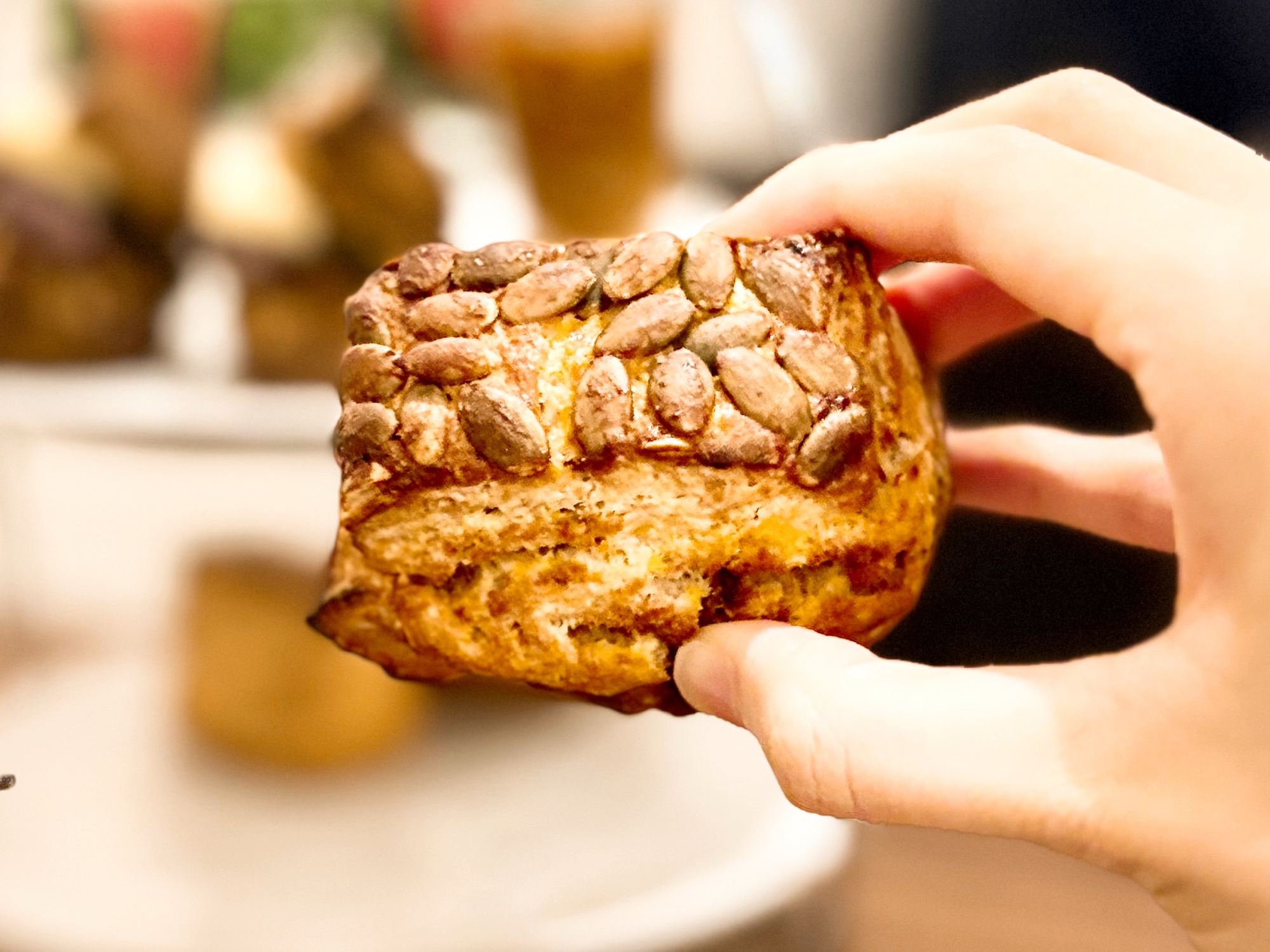 かぼちゃのスコーンは通常のスコーンのようなサクっとした食感の奥に、かぼちゃのほろほろとした味を感じられ、こちらもとても優しい味わい。