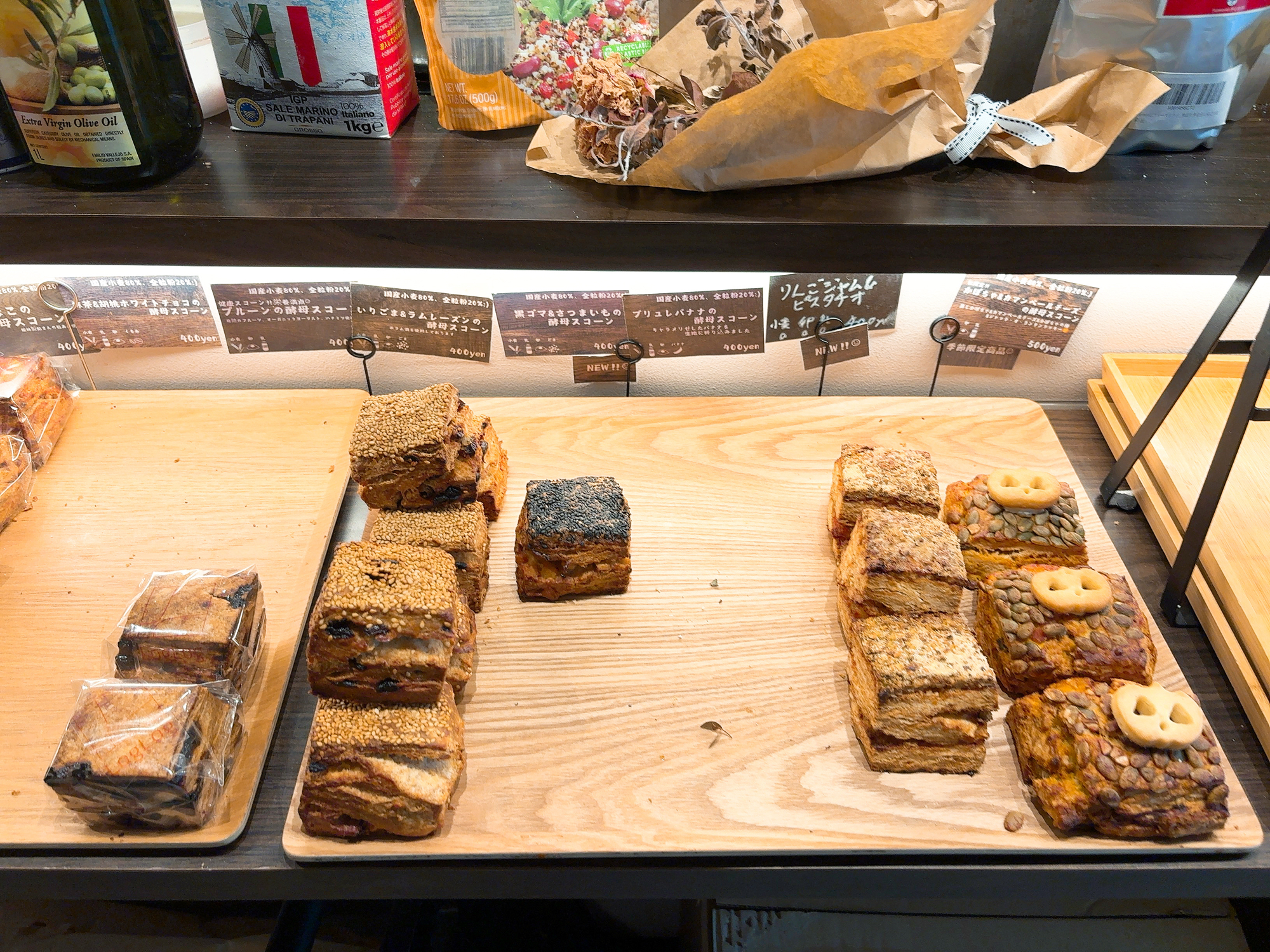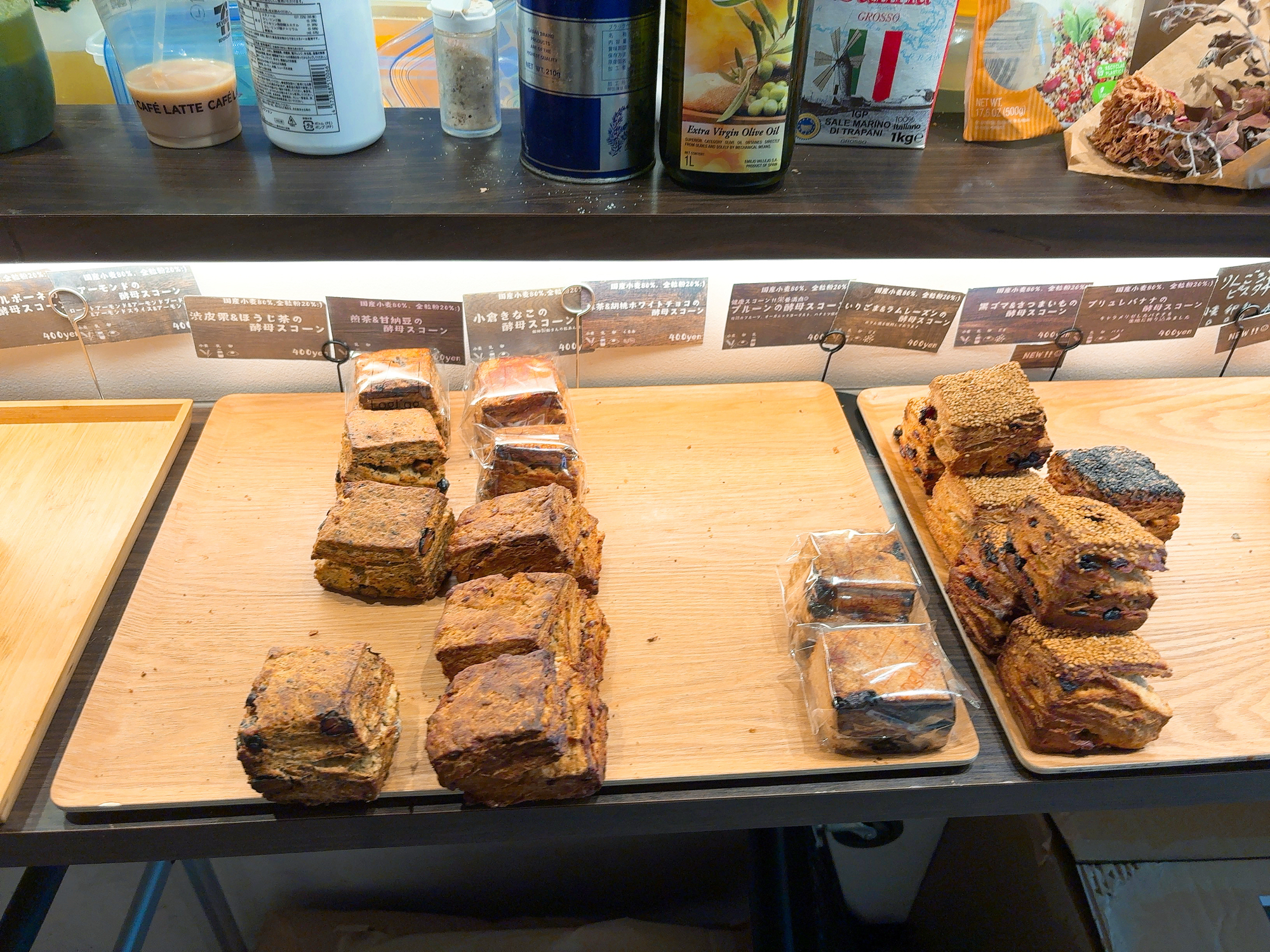 店内は奥行きのある造りになっており、入口横にはテイクアウトのパンや20種類の手作りスコーンがズラリと並びます。