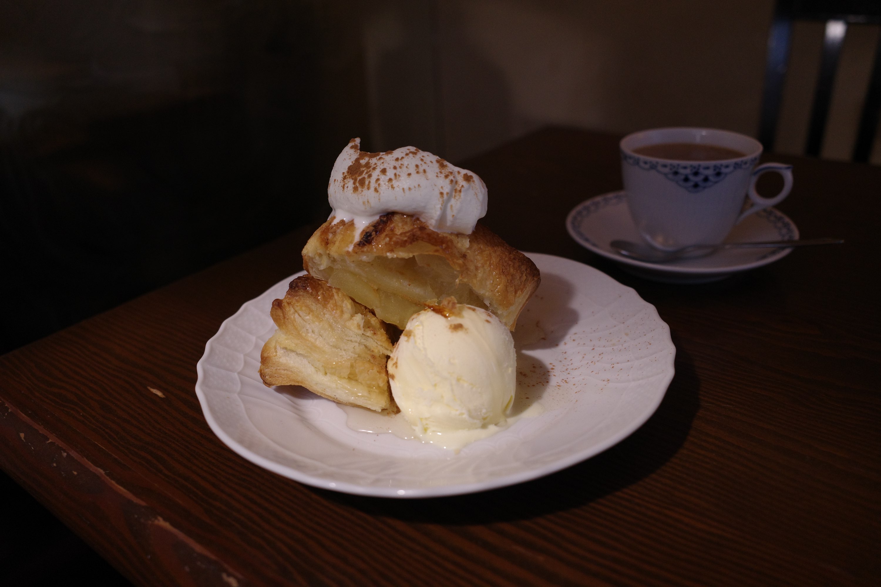 パイ生地はサクサクで香ばしく、フォークを入れると中からとろりと甘酸っぱい煮りんごが顔を出します。そこにバニラアイスをたっぷり絡めて口に運べば…言葉にならない至福のひととき。