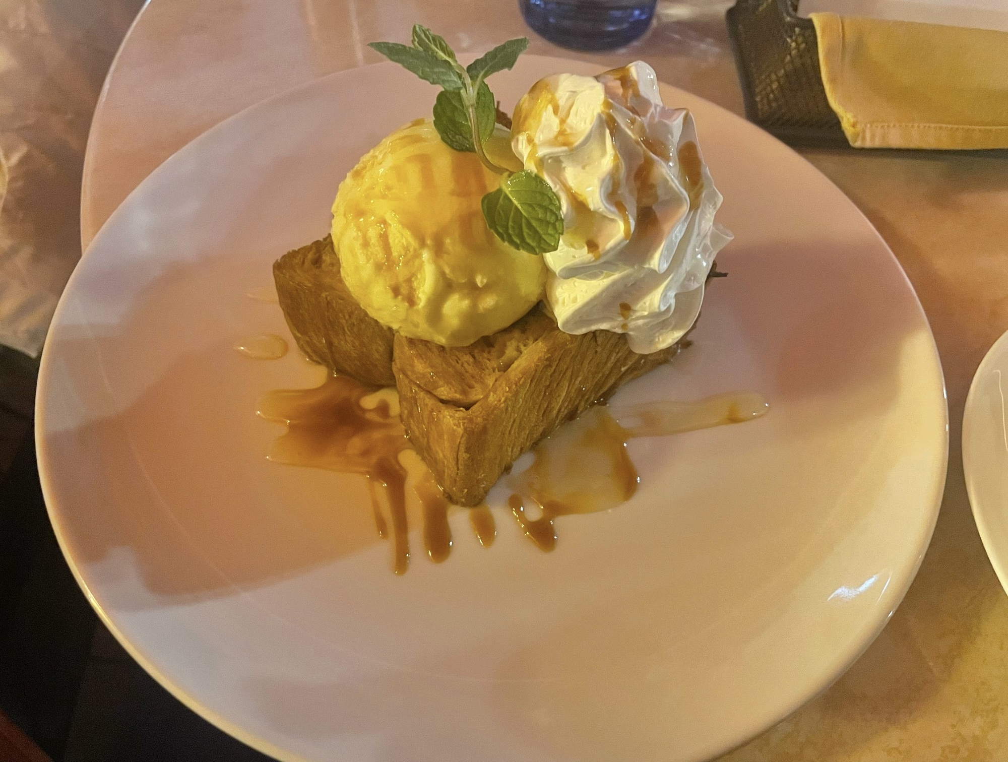 カリッとサクッと焼き上げたデニッシュトーストに大きなアイスクリームとたっぷりのホイップクリーム。その上に甘いキャラメルソースと彩り豊かなミントのグリーンが添えられた。至福の一皿!