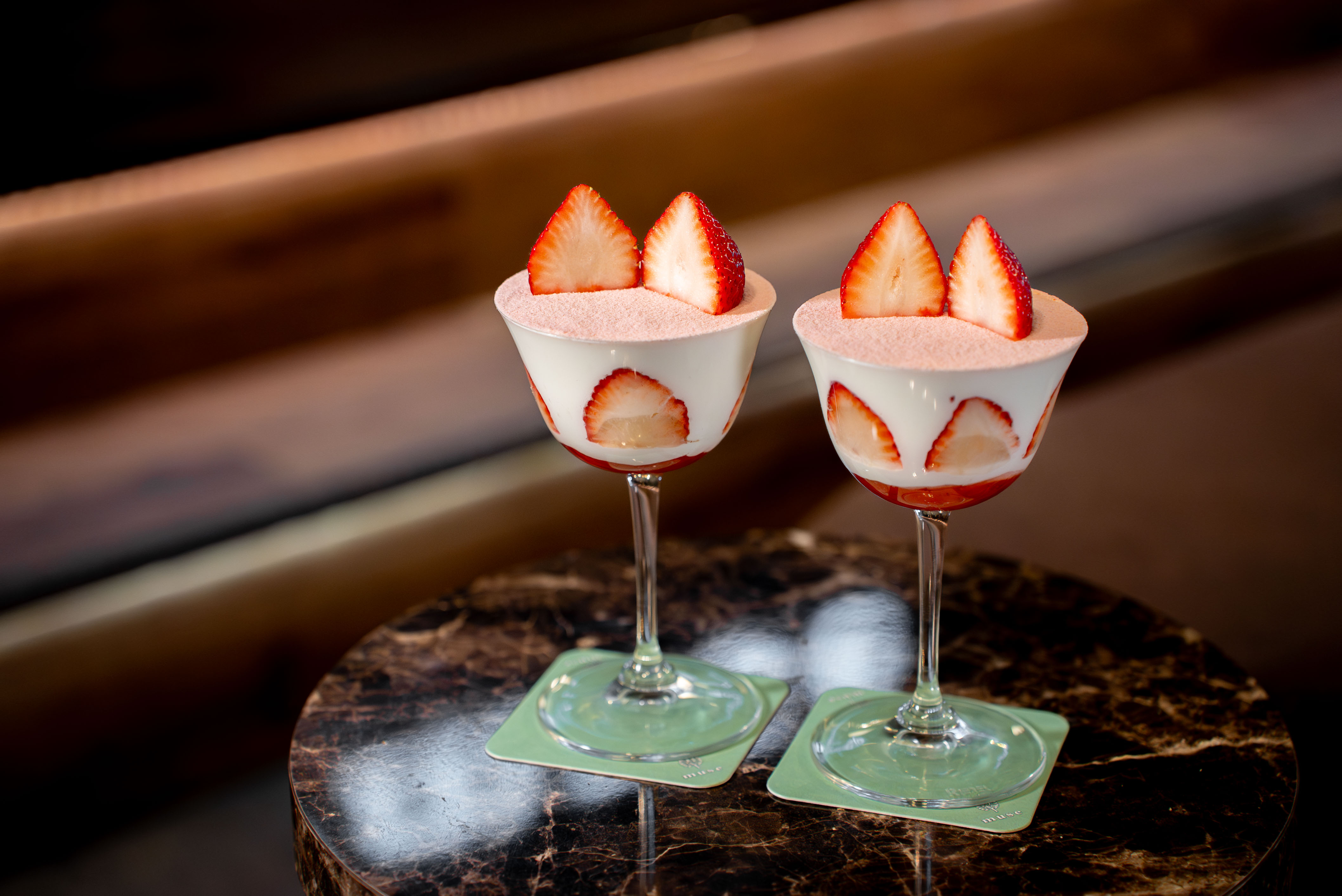 高級感あふれるグラスの中に、たっぷりの生クリームやフレッシュないちごがぎっしりとつめこまれた、見た目も美しいグラスデザートです。