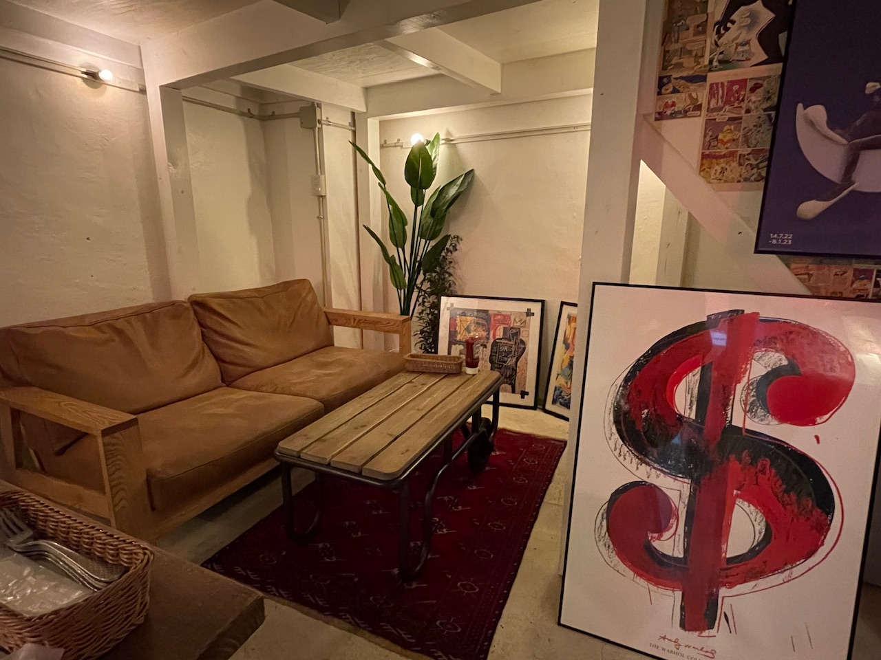 シンプルな家具にアートが融合する、そんな素敵な空間が広がっています。