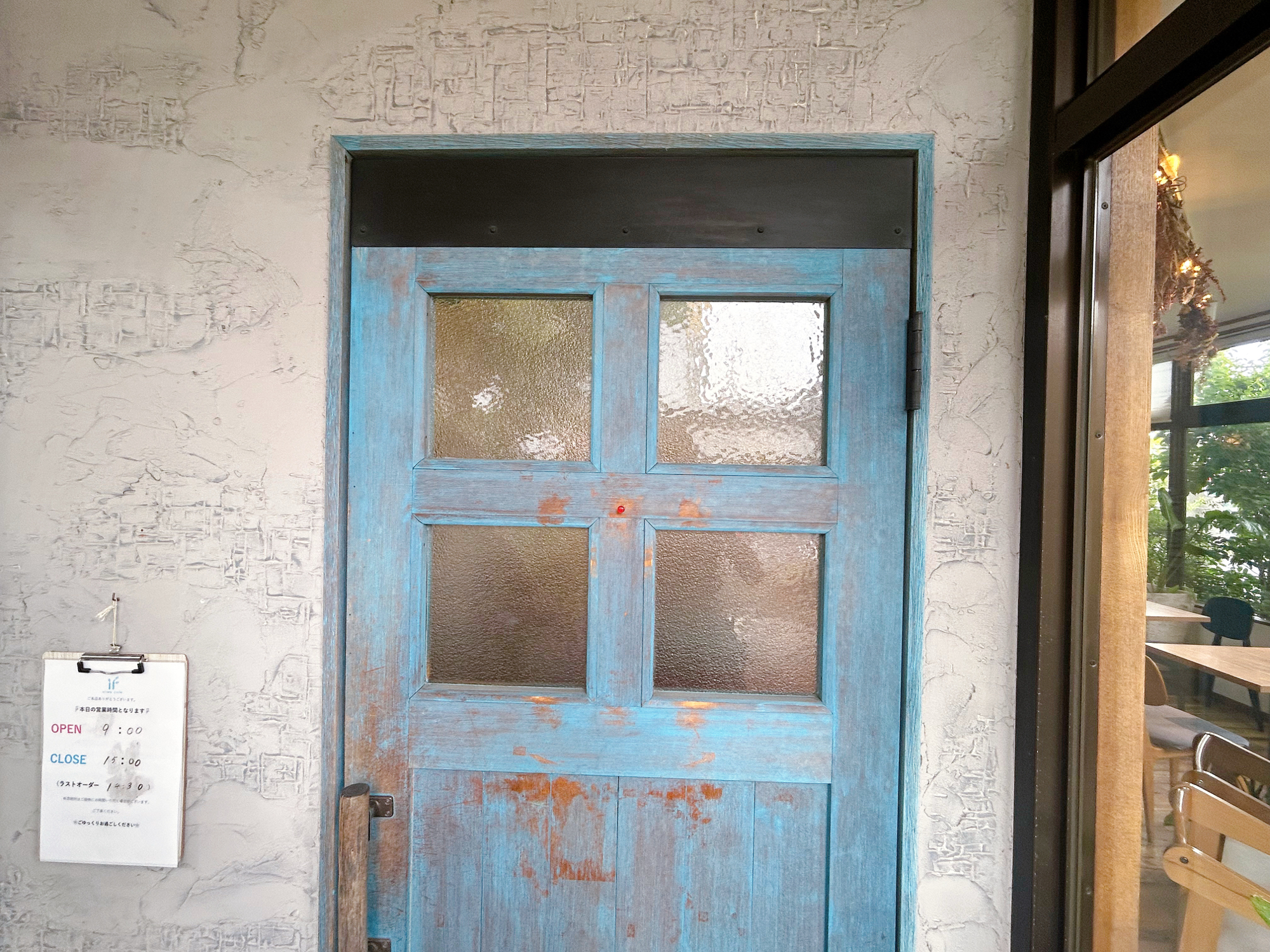 住宅街に佇んでいて、木や青色の屋根に店名が書いてあります。青色の外観が魅力のお店です。