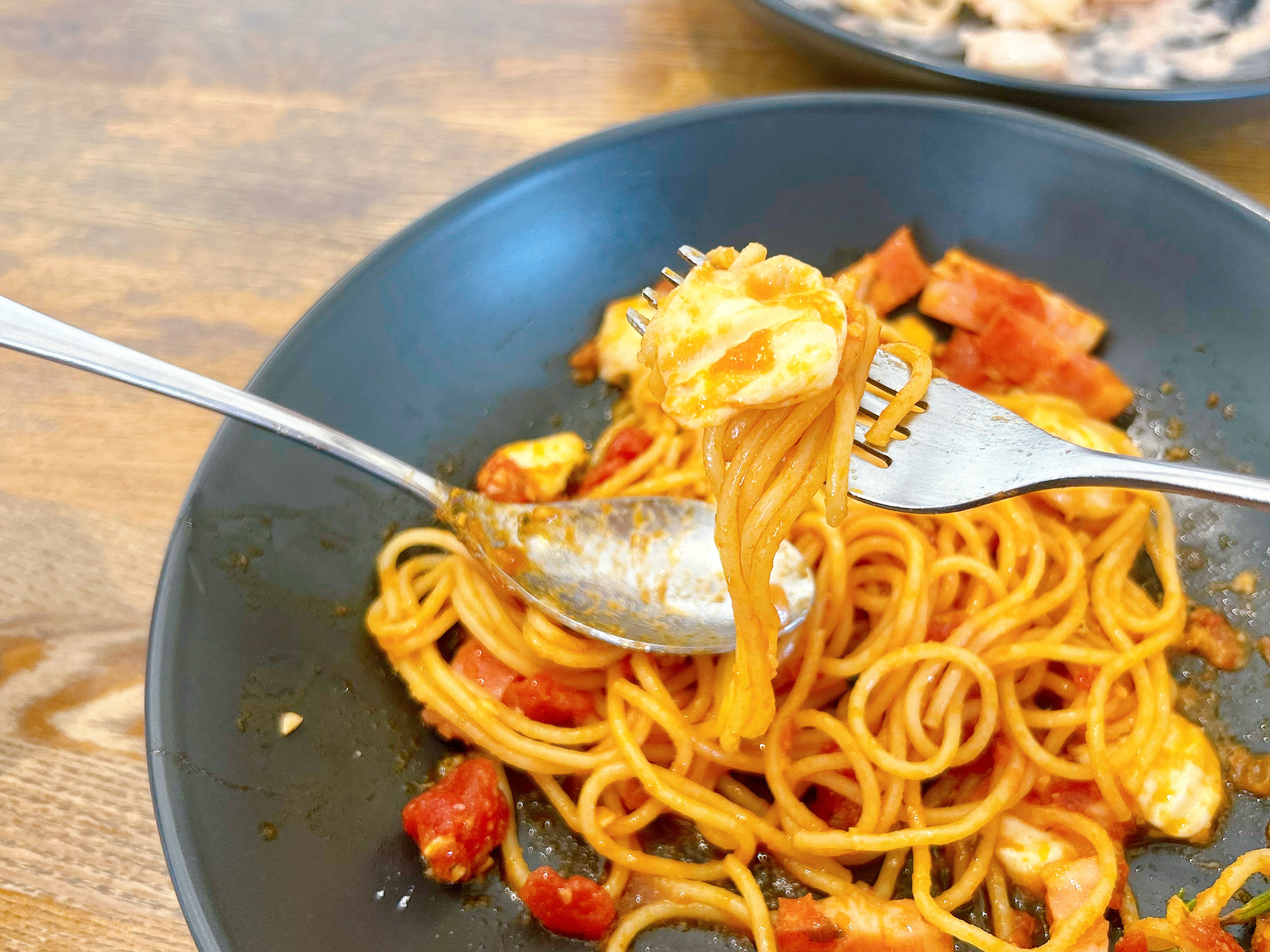 パスタはもっちもちでトマトソースも味付けがとても優しく、フォークを進める手が止まりません!