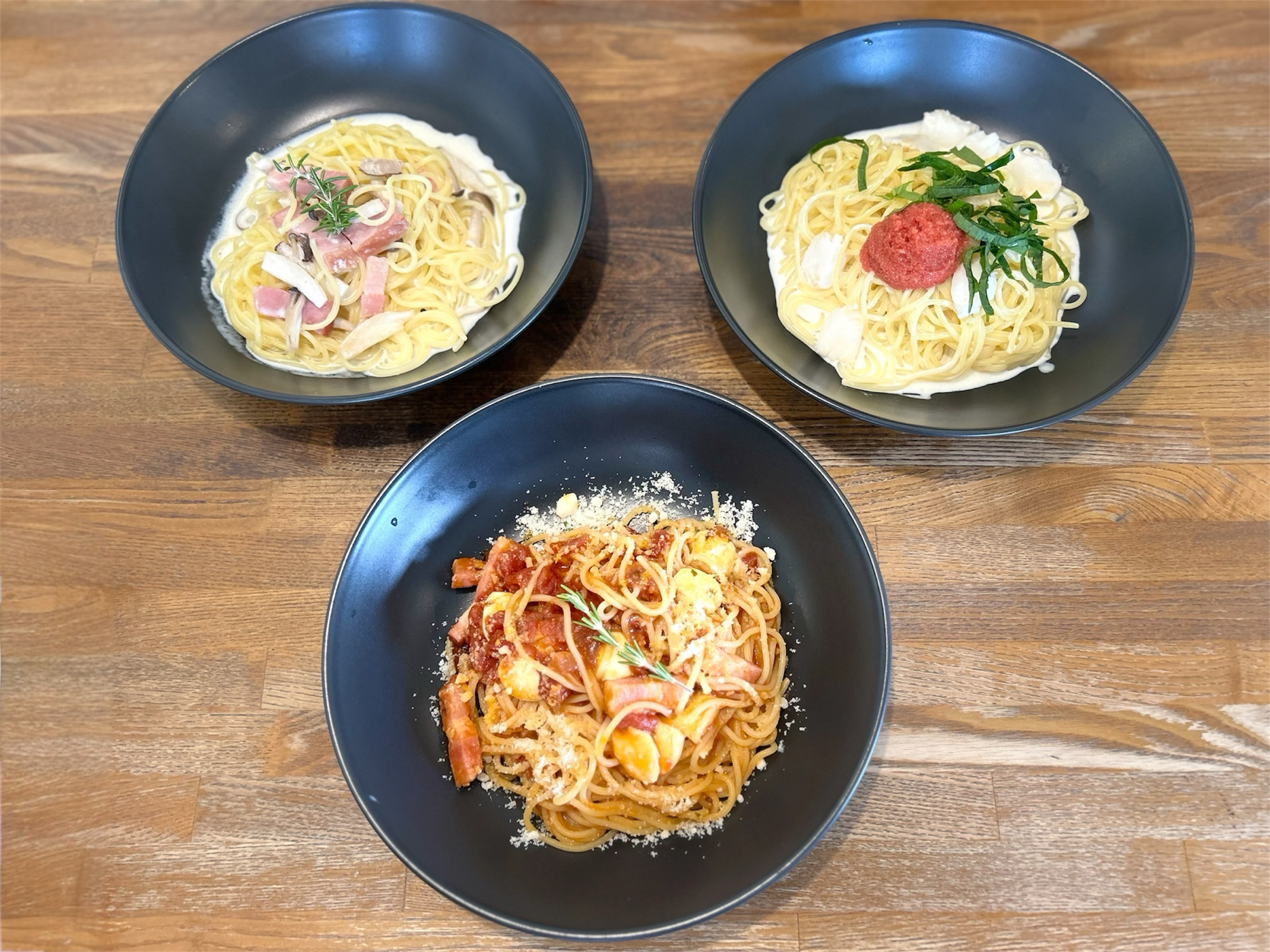 粉雪のようにかかったチーズ、赤いトマトソース、見るからにたっぷりと盛られた生パスタが黒い器に盛られ、「美味しさ」と「映え」が楽しめる一皿!
