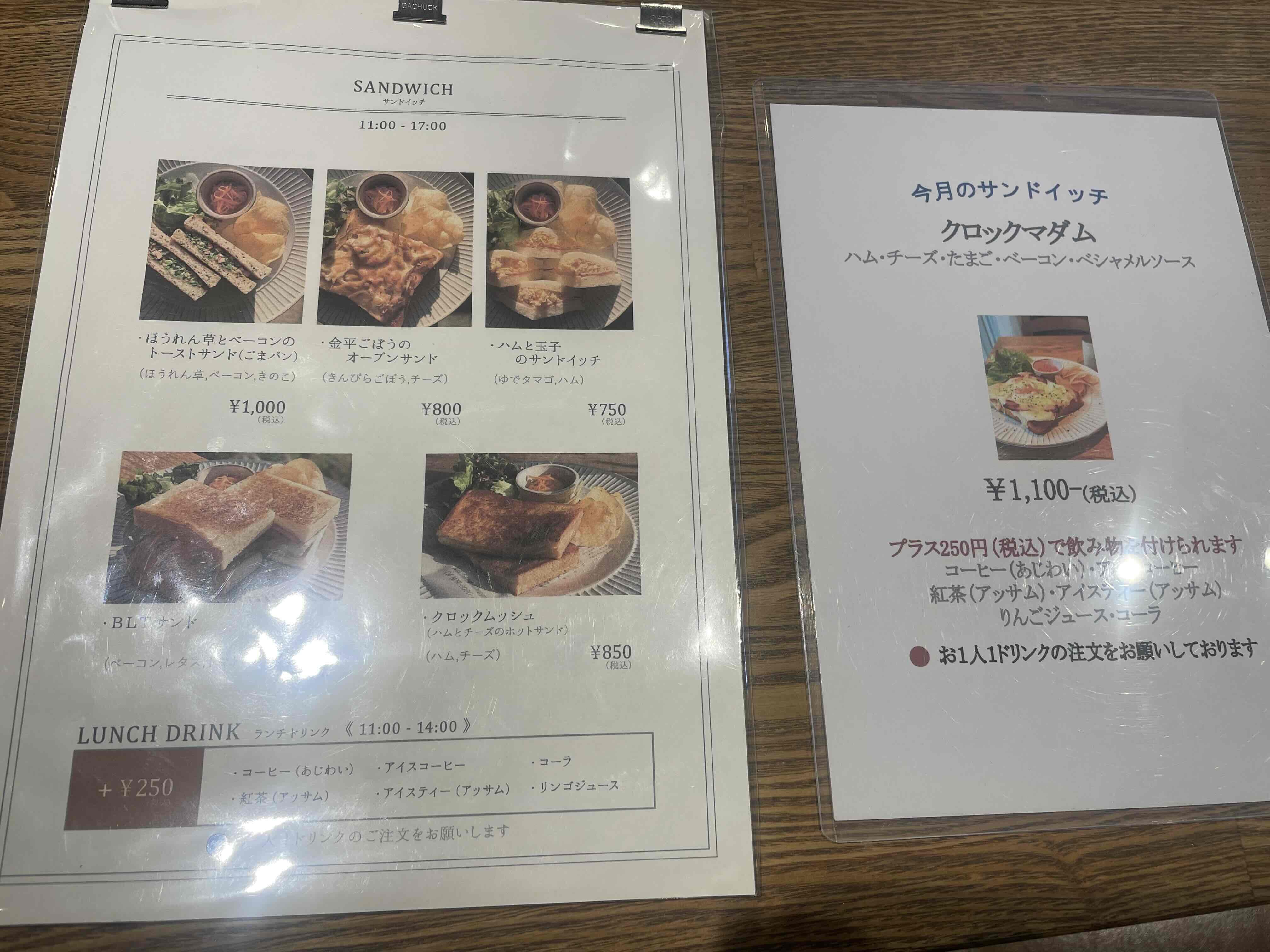 サンドイッチはランチタイムが終わっても注文できますが、ランチタイムの11時~14時の時間帯は、ランチドリンクをプラス250円でつけることができます。