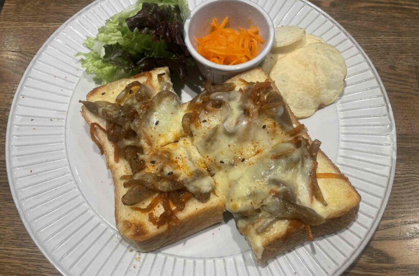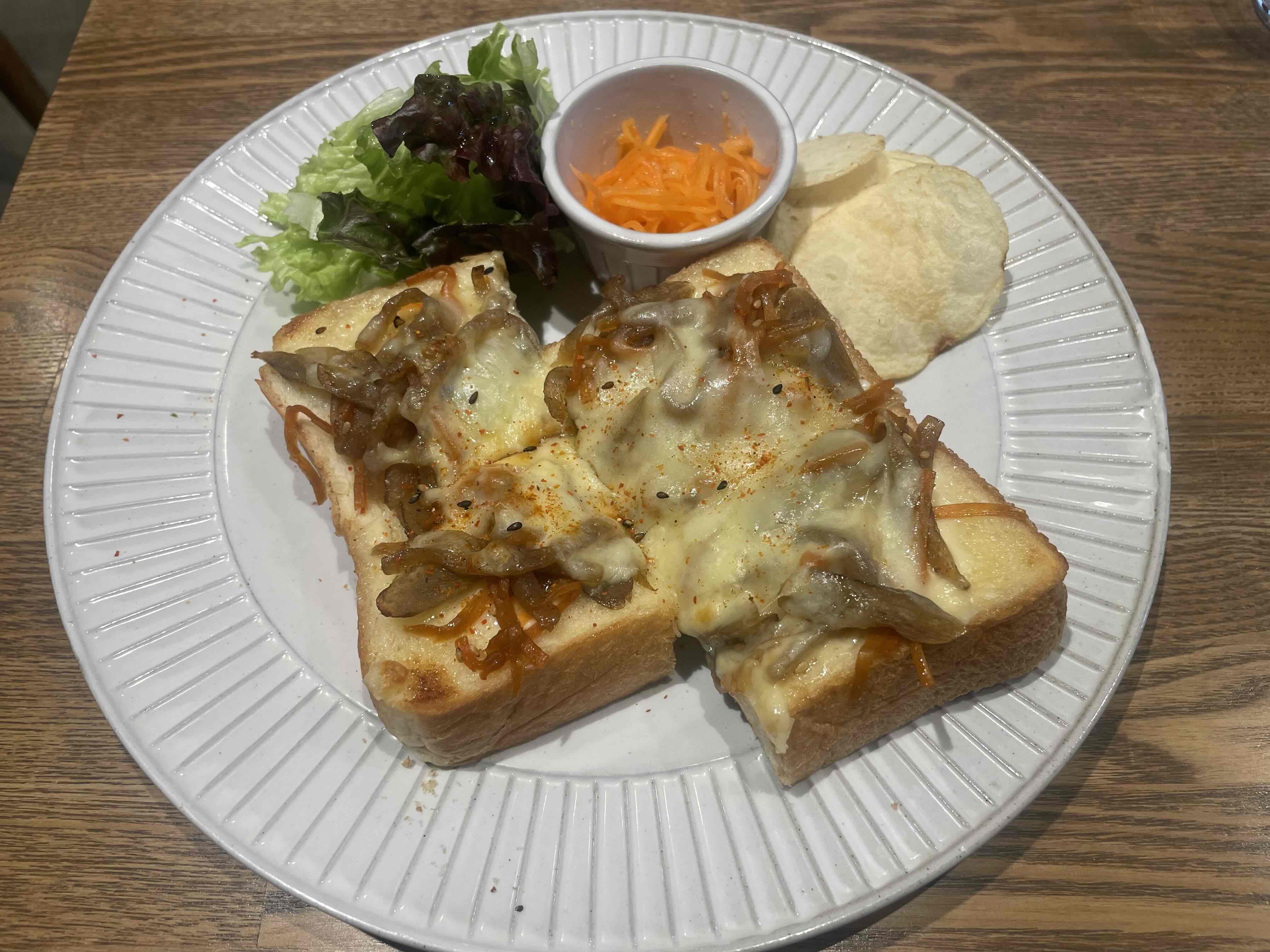 厚切りの食パンの上に、きんぴらごぼうとチーズが乗っています。この和洋の組み合わせが、絶妙なバランスで、とても美味しいです。