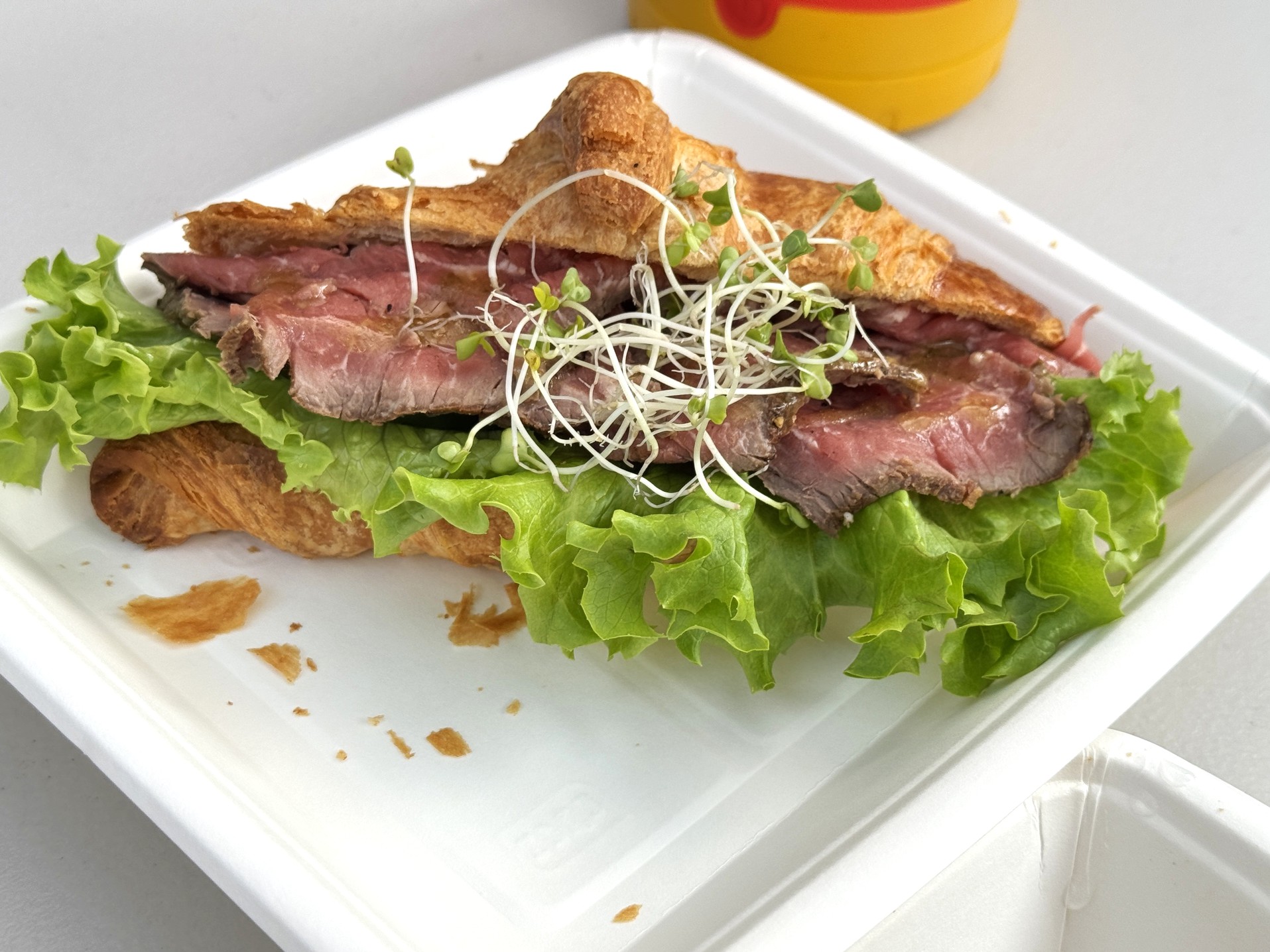 数量限定で販売されている「ローストビーフサンド」は、国産牛肉を使ったレア感のあるローストビーフをたっぷりと挟んだ贅沢なサンドイッチ。基本のソースはわさびソースで、辛いものが苦手な場合はオニオンソースへ変更することができます。