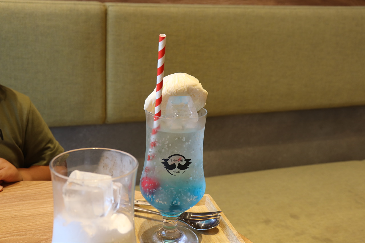 名前が和風な青富士クリームソーダは、ライチ風味。綺麗なブルーのソーダがキラキラして、お子様のテンションが上がること間違いなし!