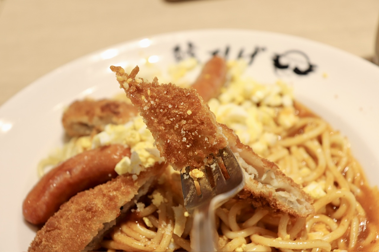 魚フライとソーセージというあんかけスパに相性抜群のふたつのトッピングが楽しめますよ。粗く潰したゆで卵ものっていて美味しそう!
