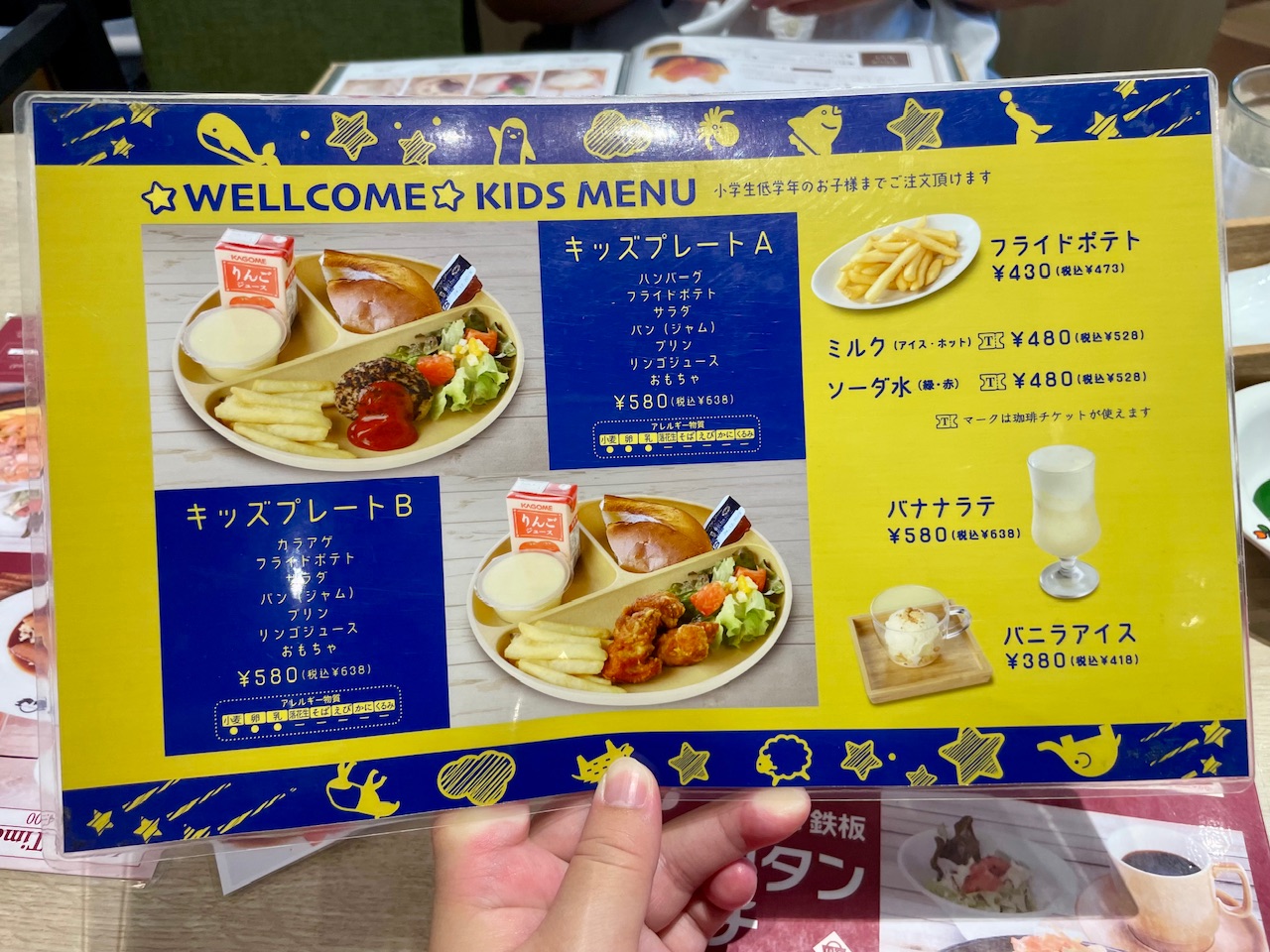 小学校低学年まで注文可能のキッズメニューあり。メインはハンバーグか唐揚げかセレクトできます!