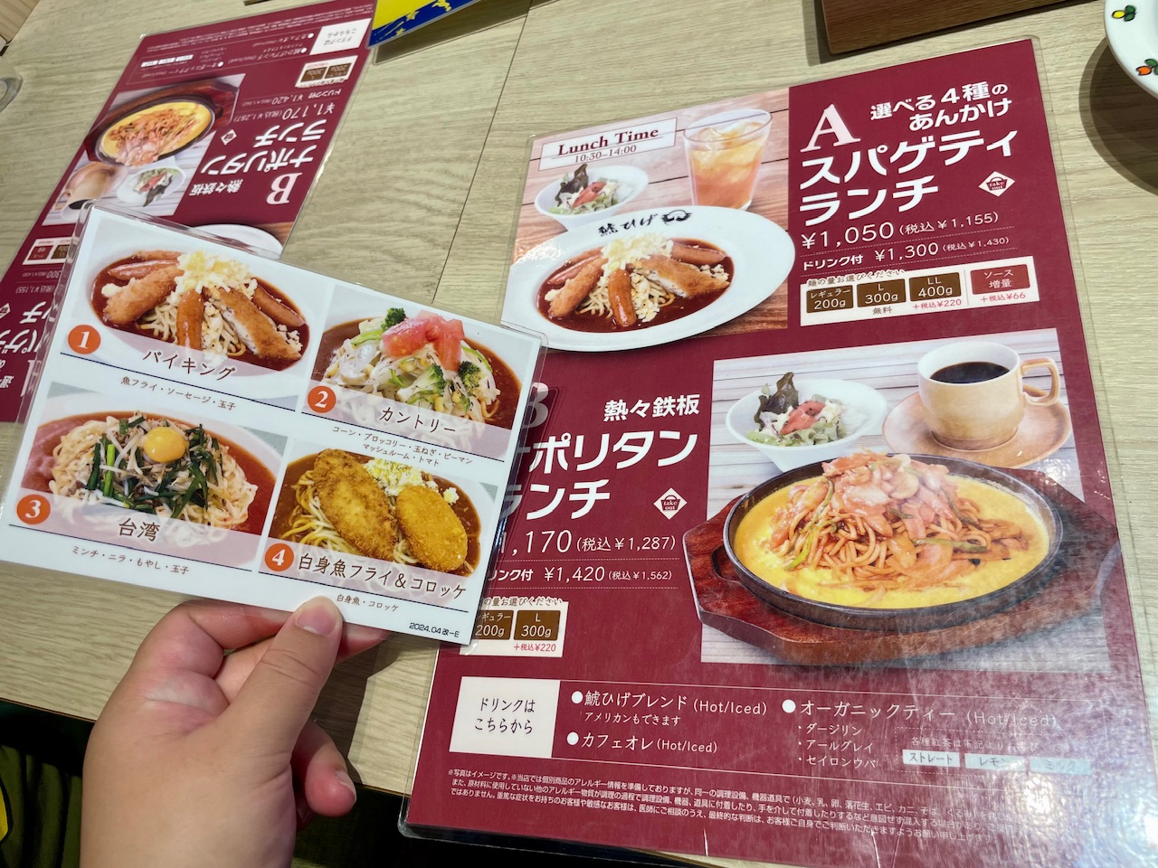 こちらは10時半から14時限定のランチメニュー。選べるお得なスパゲッティとドリンクがお値打ちにいただけますよ。