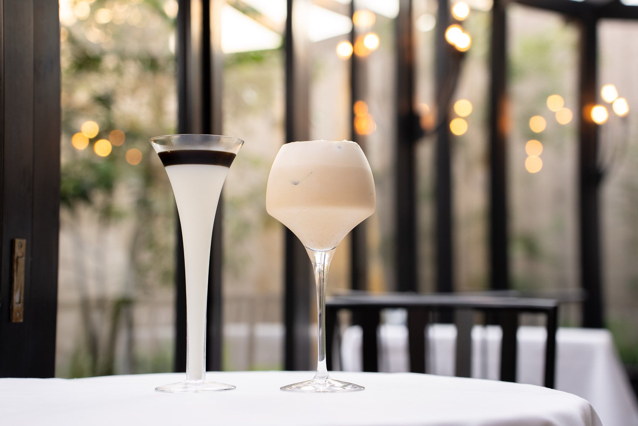 ひとつは長細い形をした、珍しいデザインのグラス。もうひとつは、ワイングラスのように口元が大きく広がったグラスで提供されていました。