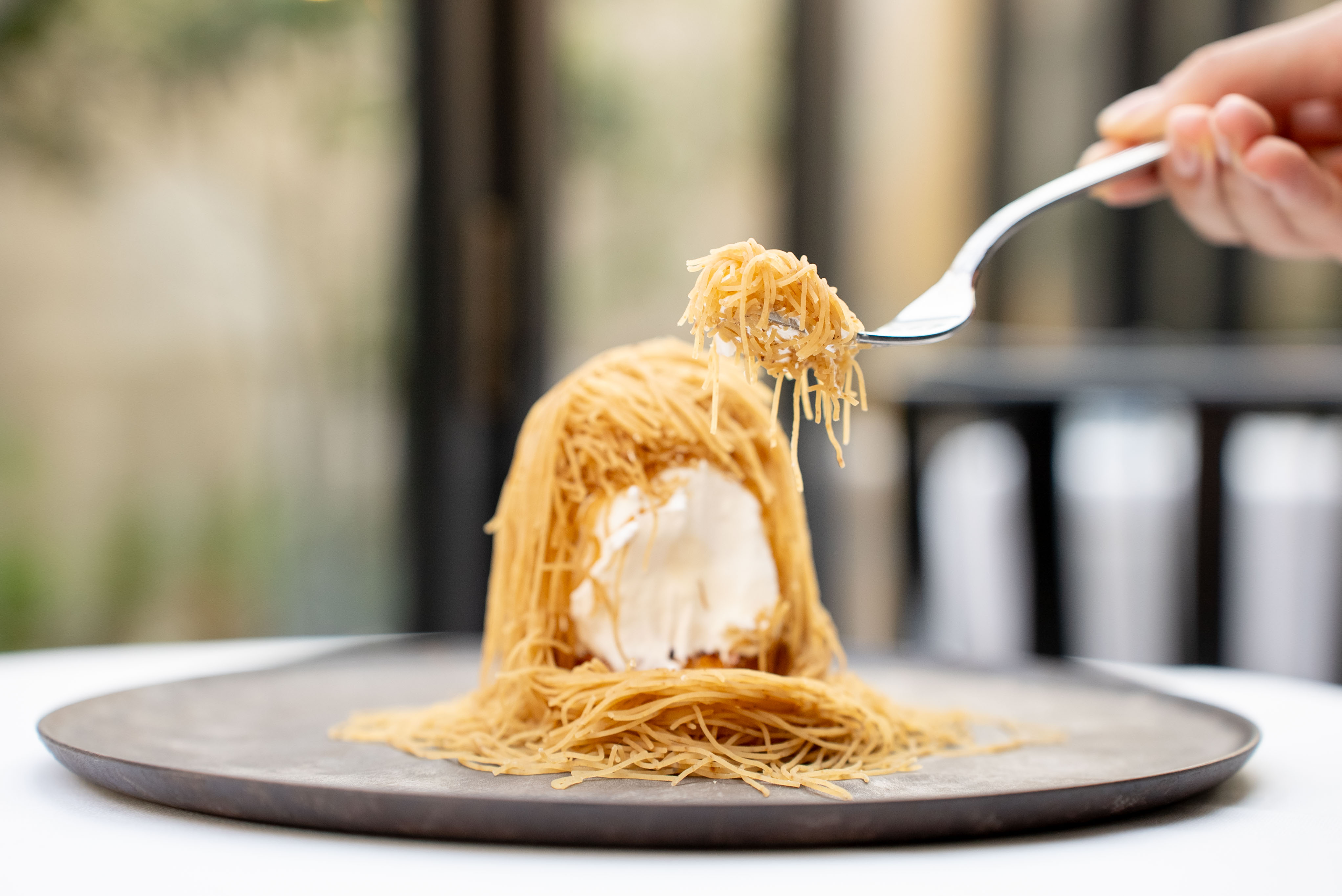 このモンブランの最大の魅力は、客席でモンブランを絞って仕上げてくれるライブ感。
