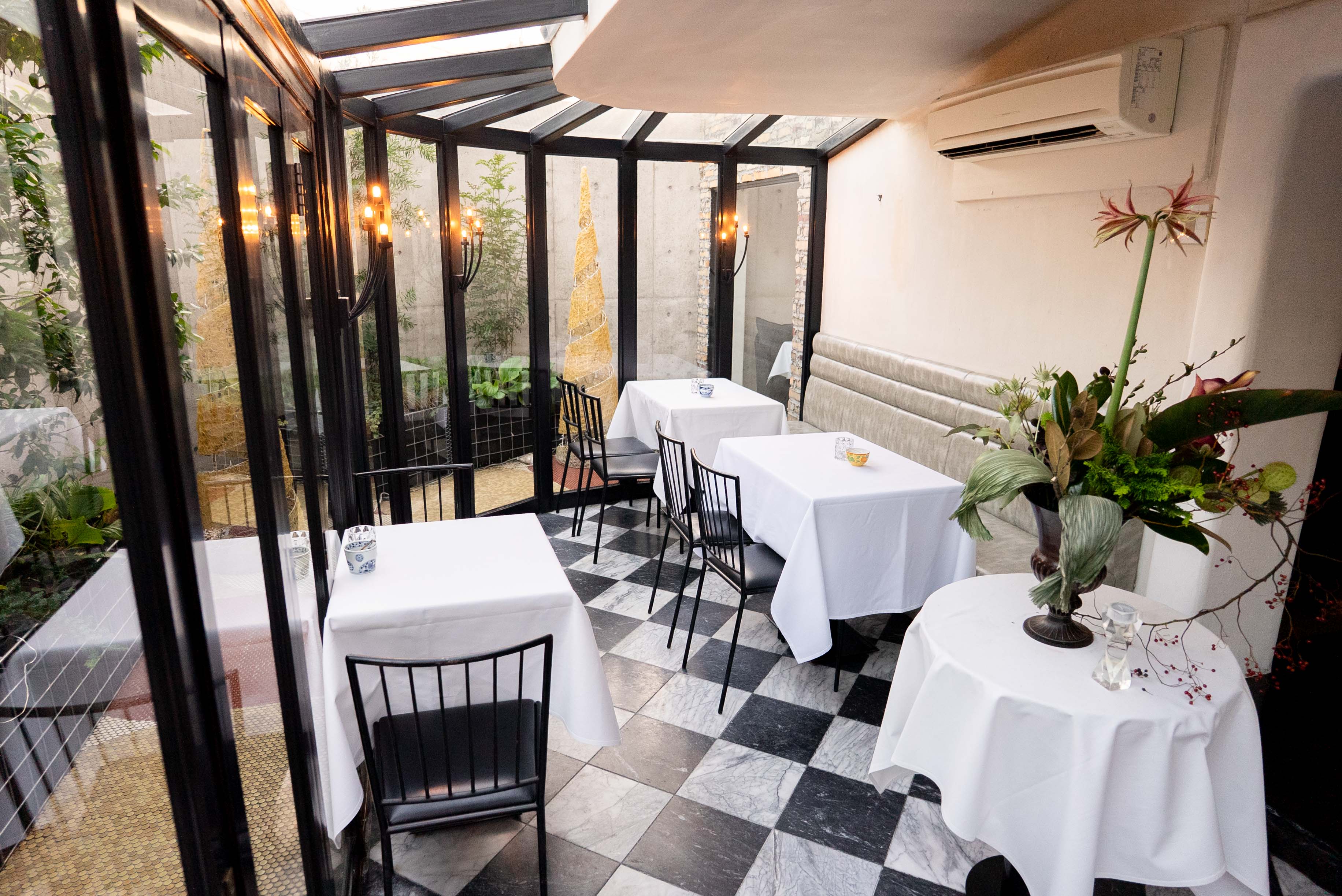 テラス席は、お昼は自然光が差し込み、夜はろうそくが灯るムーディーな雰囲気に。特別な日のティータイムにも最適◎