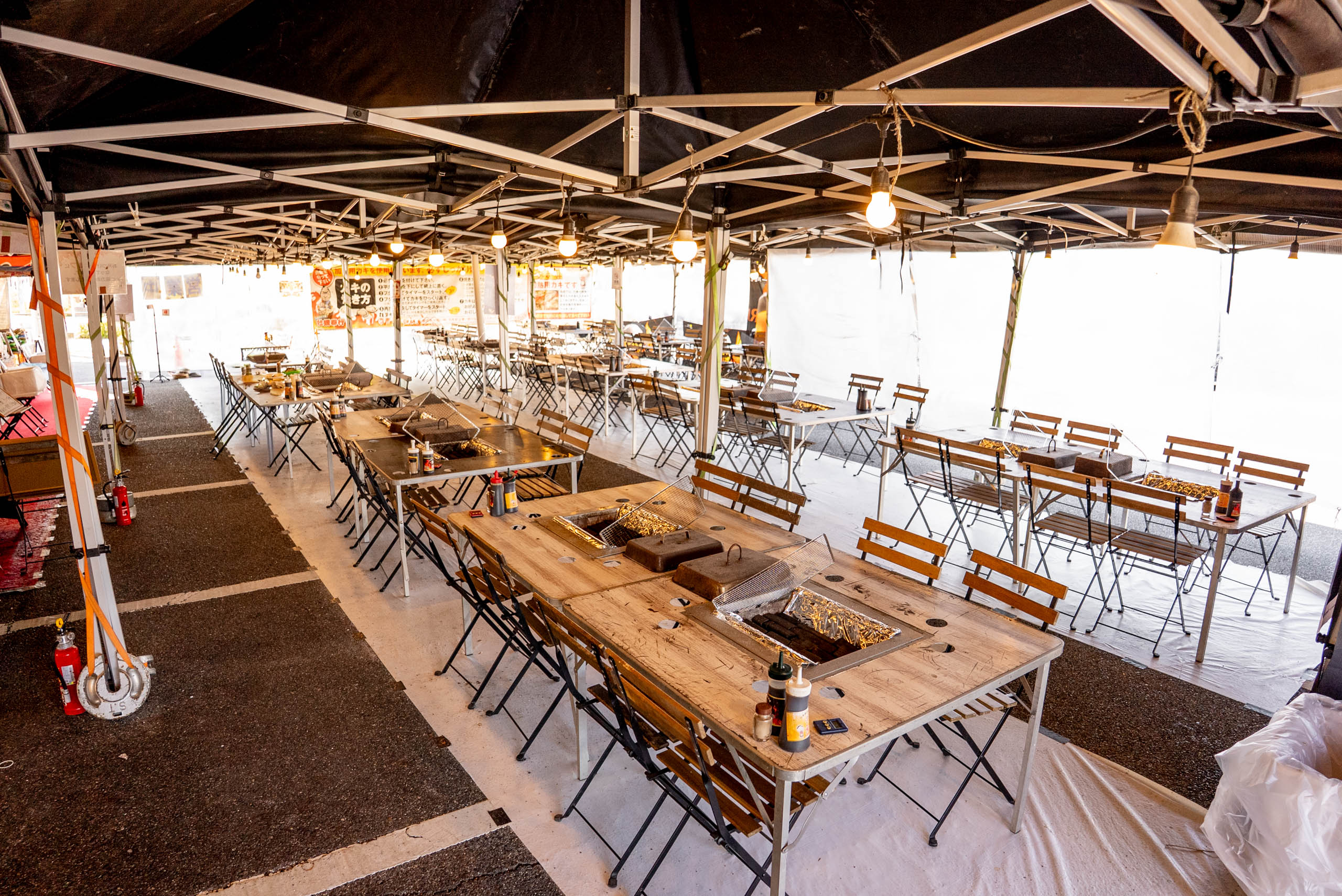 駐車場の一角に設けられた特設会場には、なんと全104席ものイートインスペースが!想像以上に広々としており、グループや家族連れでもゆったりと過ごせます。