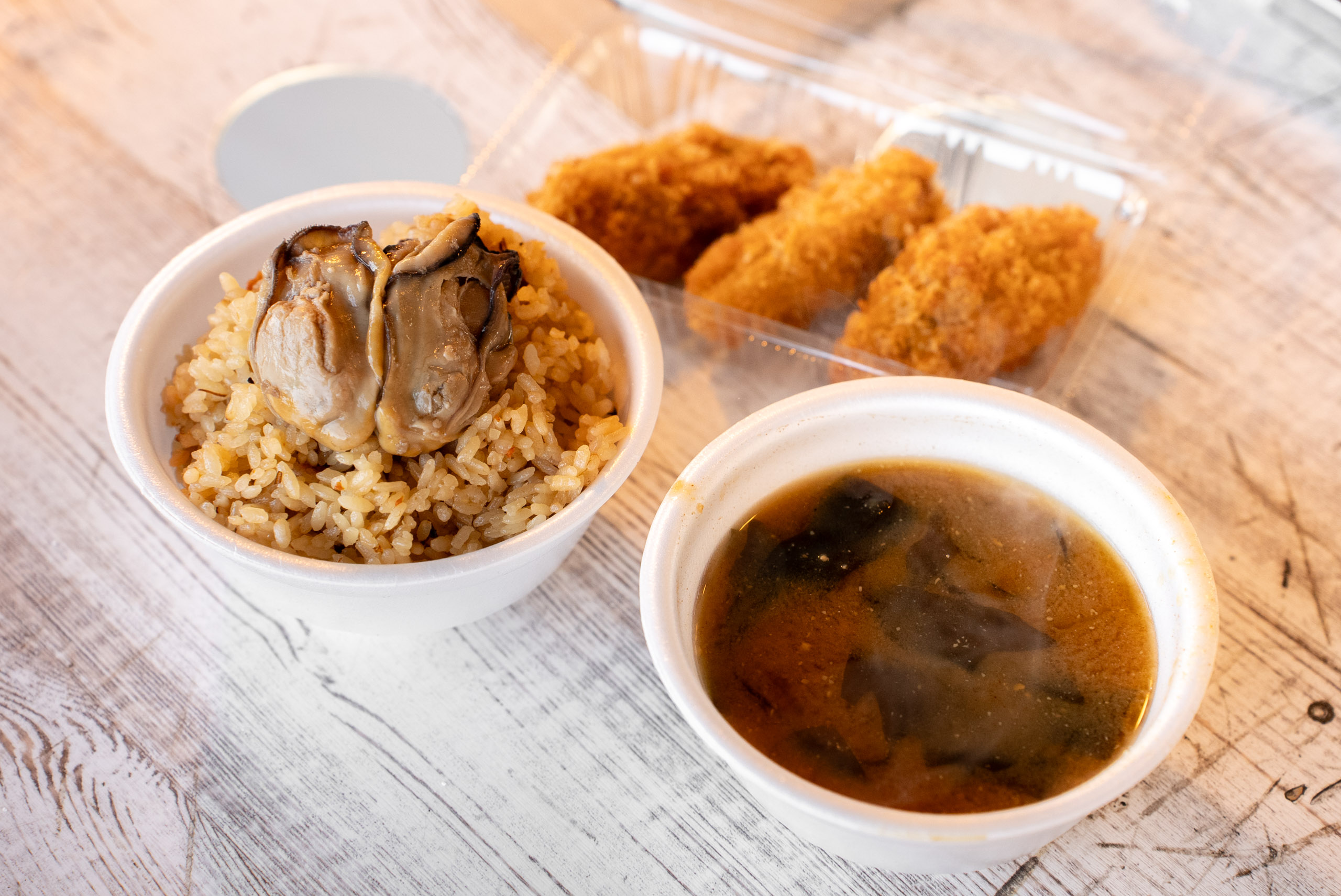 味噌汁は、牡蠣の出汁をベースにした合わせ味噌を使った、牡蠣好きにはたまらない一杯。具材にも牡蠣がしっかり入っており、スープからも牡蠣の旨みがじんわりと染み渡ります。それぞれワンコインで楽しめる手軽さもポイントです!