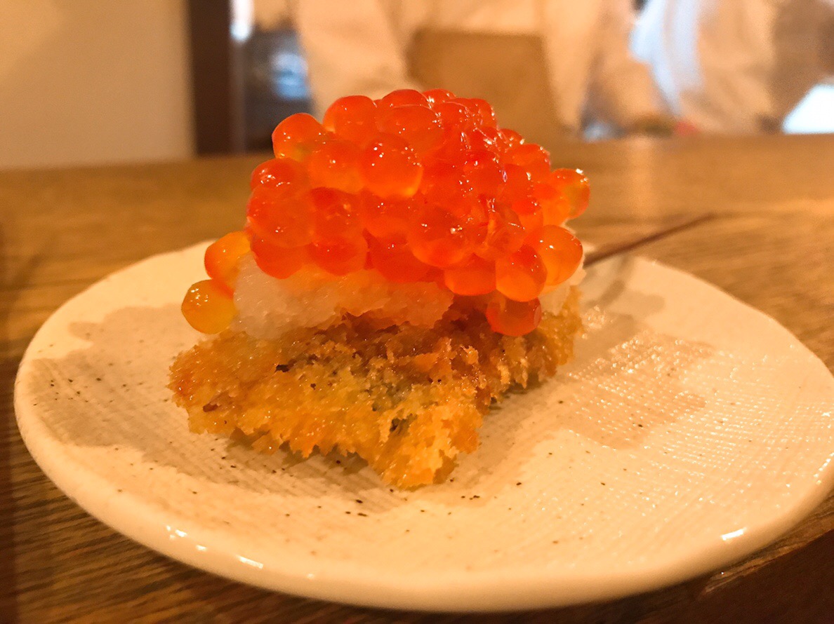 一口頬張ると…なんと、こちら大根おろしといくらの下には「のり」の串揚げが!意外な組み合わせに驚くこと間違いなし。