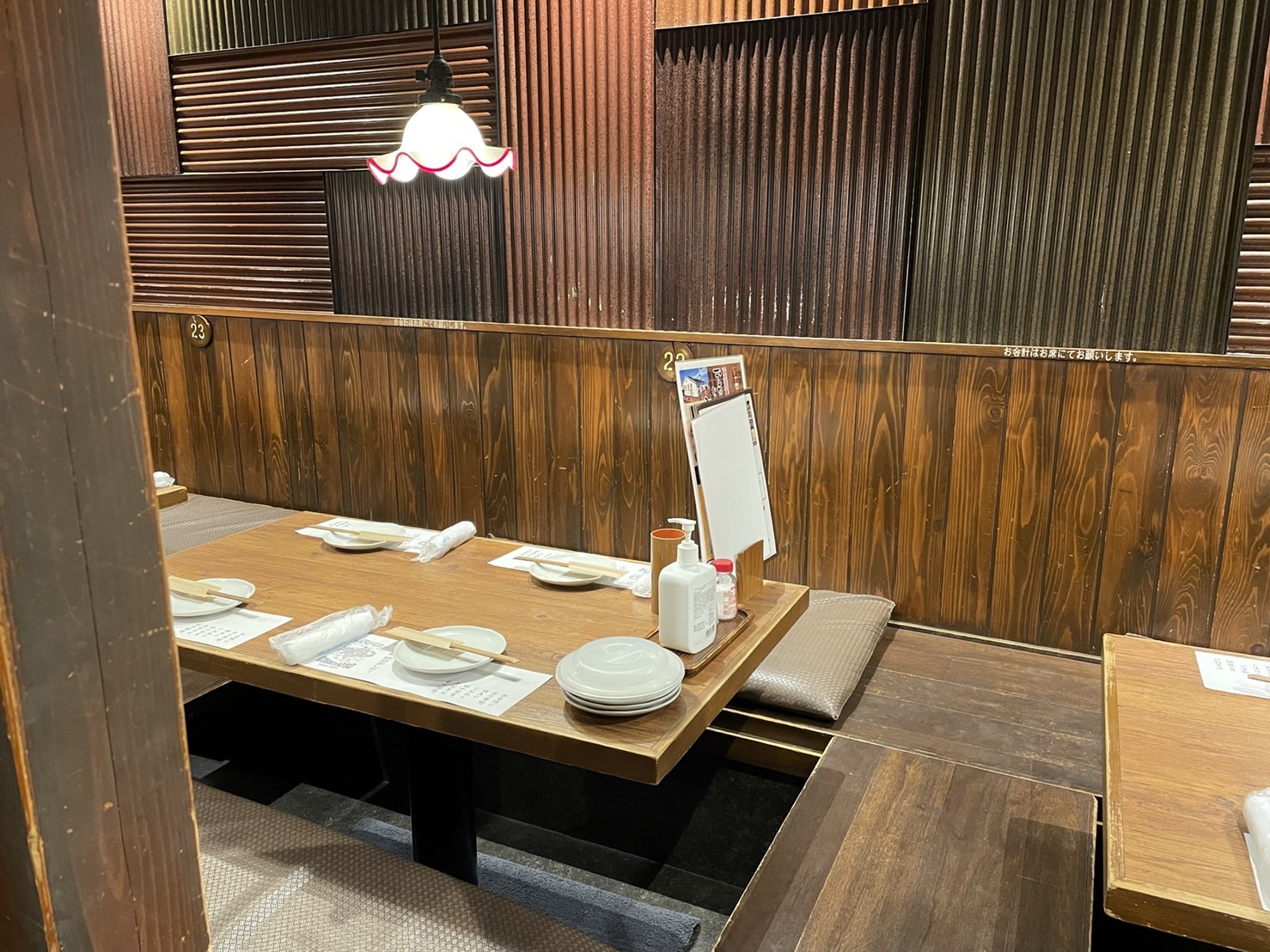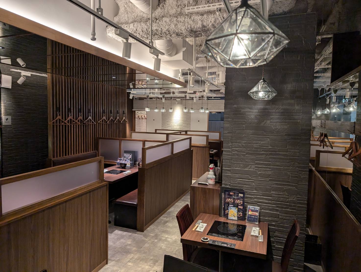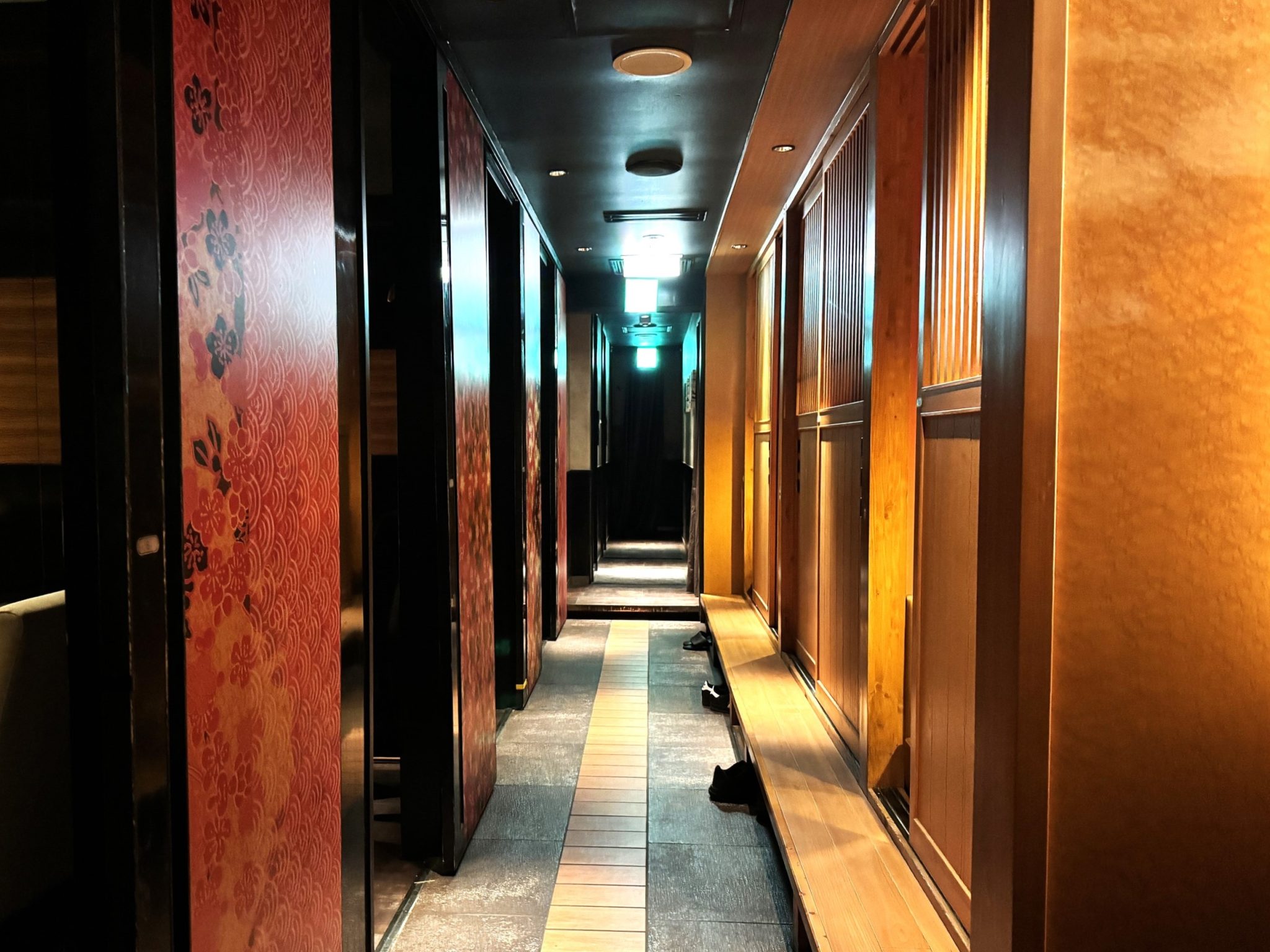 ビルの3階にあるお店は、入口から見るとこぢんまりとした印象ですが、奥へ進むと長い通路の両サイドに半個室のテーブル席がずらりと並んでいます。