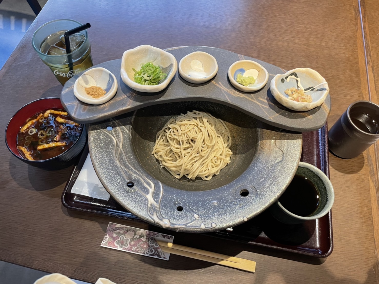 香り高く、すすった時の鼻から抜ける蕎麦粉の香りも感じられ、五感で楽しみながらいただけます。小皿に盛られた薬味は全部で5種類(粉末鰹節、小ネギ、塩、ワサビ、ミョウガ)。