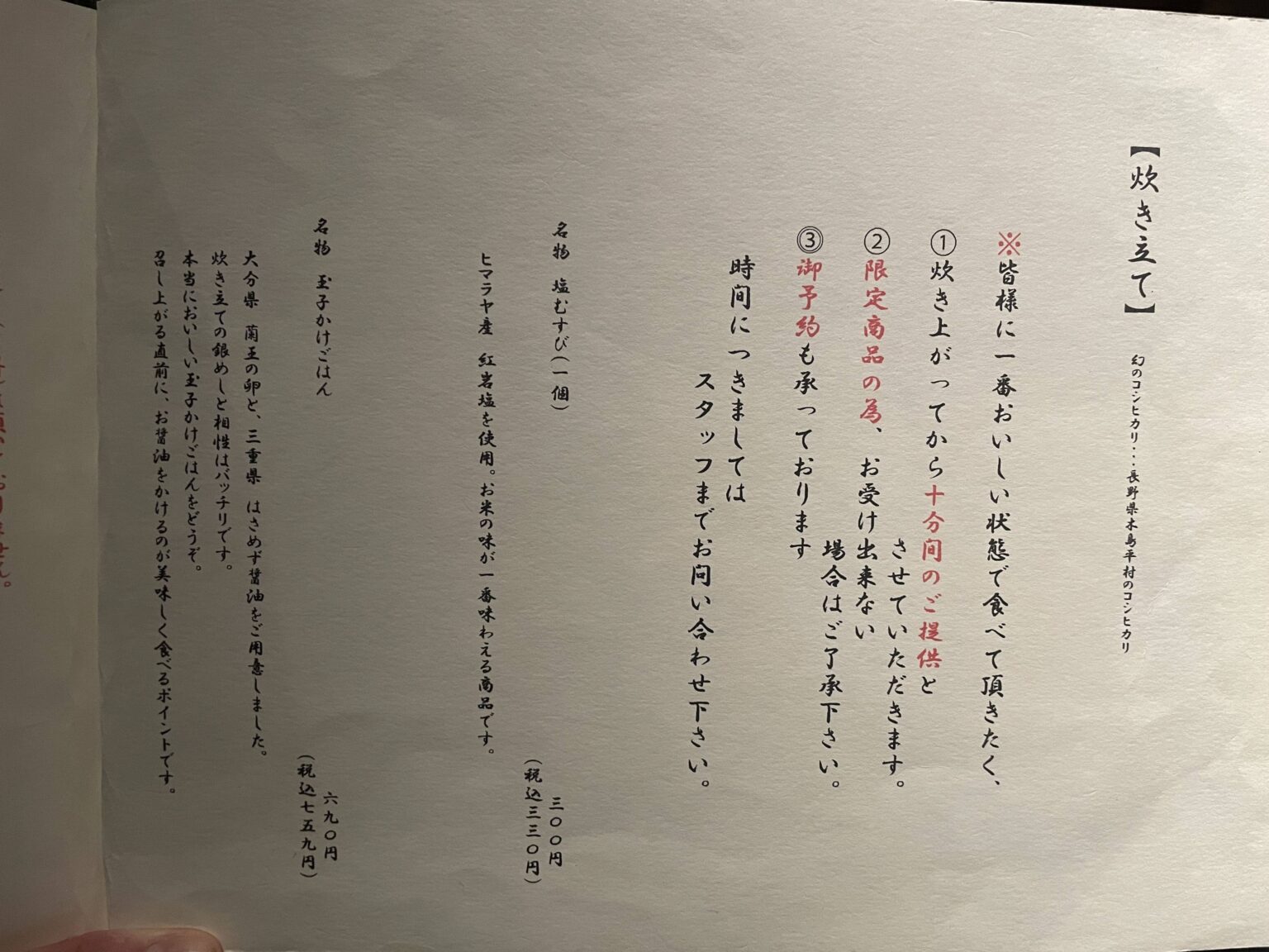席に着いた時に炊き上がり時間を教えてくれますが、お客さんが多いと売り切れる場合もあるため、先に予約するのがベストですよ。